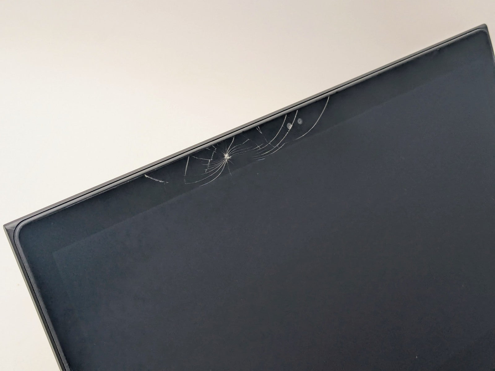Cosmetic Defects: Interior: Display cracked at top middle. Palmrest has heavy wear. Exterior: Top cover has moderate wear/visible scratches. Bottom cover has heavy wear/engraved writing/scratches. Some wear on foot covers.