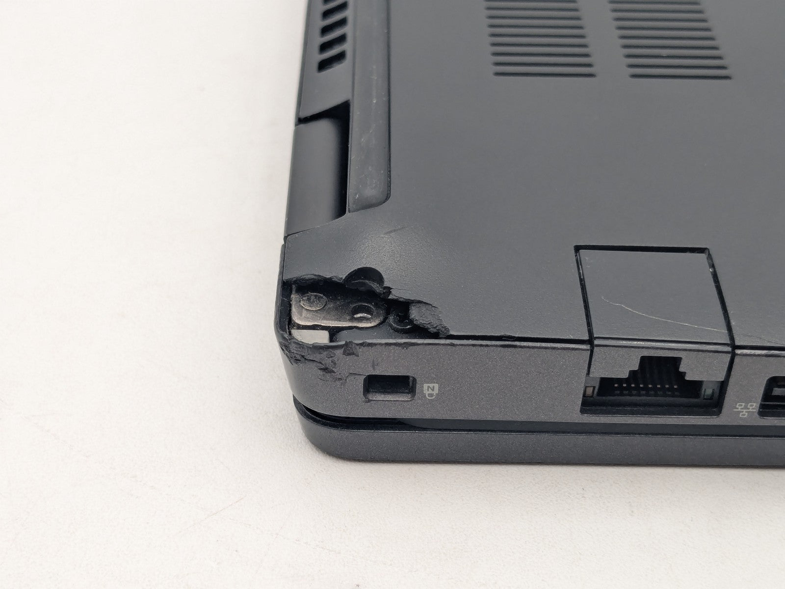 Cosmetic Defects: Interior: Display has visible keyboard imprinting. Moderate wear on display bezel, keyboard, palmrest, and touchpad. Exterior: Paint scratches, scuffs, and cracks covering top cover. Surface scratches and sticker stains on bottom cover. Large patch of missing plastic on one corner of bottom cover. Dents and chips covering corners.
