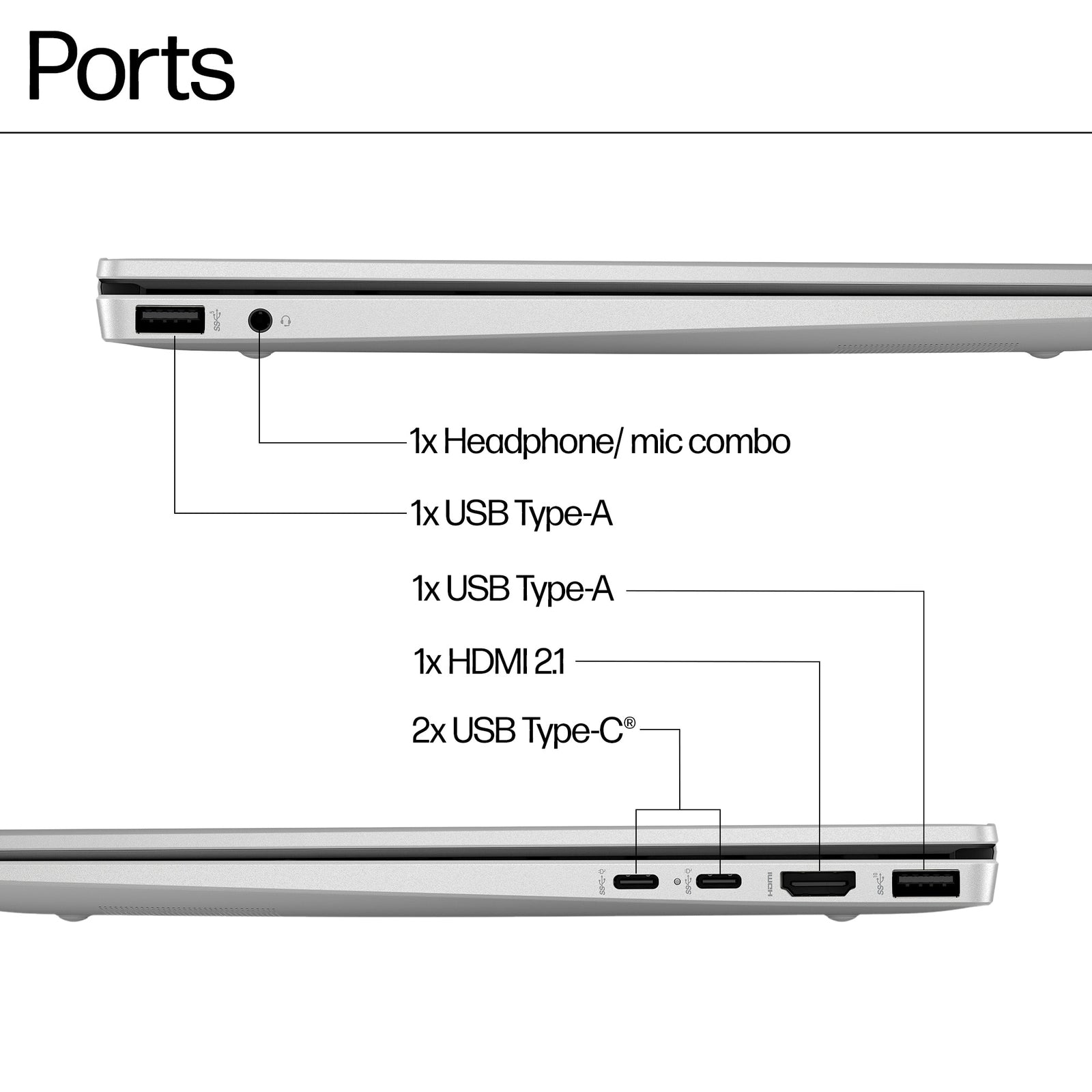 •External I/O Ports: 2 USB Type-C® 10Gbps signaling rate (USB Power Delivery, DisplayPort™ 1.4, HP Sleep and Charge) 1 USB Type-A 10Gbps signaling rate 1 USB Type-A 5Gbps signaling rate 1 HDMI-out 2.1 1 headphone/microphone combo