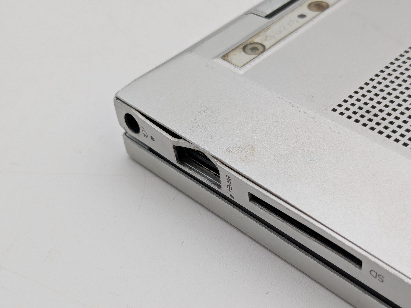 Cosmetic Defects: Interior: Display has visible scratches and keyboard imprinting, large crack on top right corner. Visible wear and scratches on keyboard, palm rest, and hinges. Exterior: Visible wear and scratches on lid and bottom cover. Missing bottom rubber feet. Dented on corner, cover does not fully close. Dents and scratches around edges of device, USB port dented but still operates.