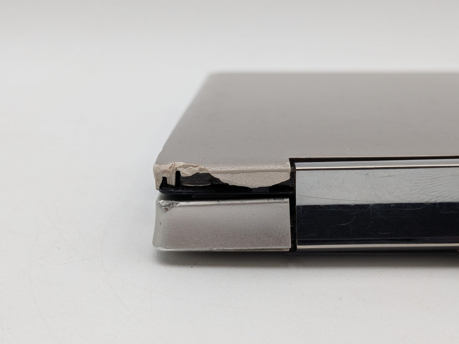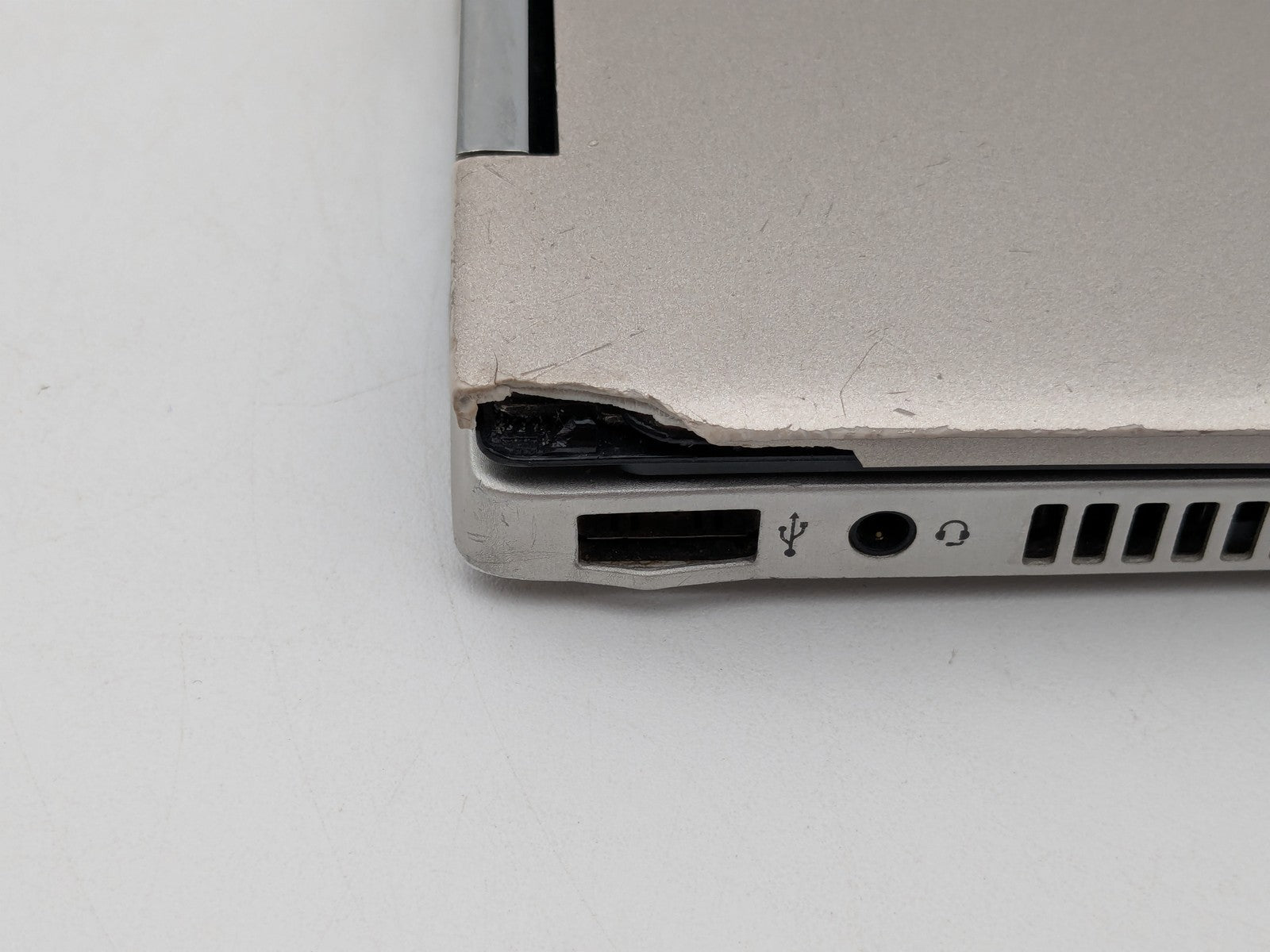 Cosmetic Defects: Interior: Display has visible scratches/keyboard imprinting and is cracked/shattered. Screw exposed in lower left corner. Palm rest has heavy wear/scratches. Exterior: Top cover has heavy wear/scratches/missing plastic. Bottom cover has heavy wear/scratches. Left and right edges have small bends/dents.