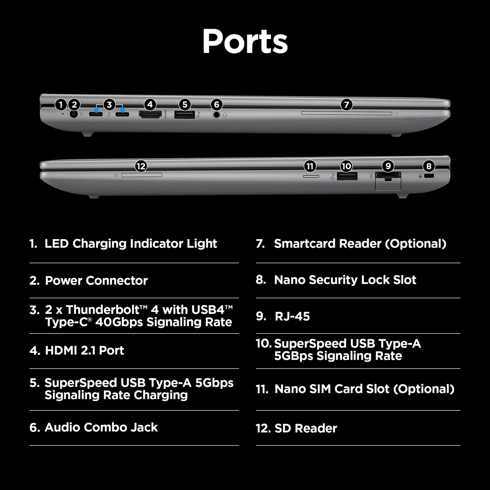•External I/O Ports: Left side : 1 USB Type-A 5Gbps signaling rate (charging) 1 HDMI 2.1 1 headphone/microphone combo 1 power connector 2 Thunderbolt™ 4 with USB Type-C® 40Gbps signaling rate (USB Power Delivery, DisplayPort™ 2.1)