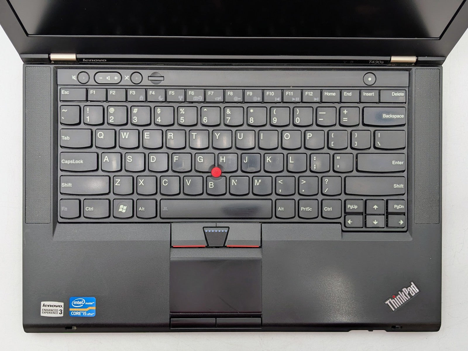 Cosmetic Defects: Interior: Small patches of uneven backlight on display. Heavy wear on touchpad and keys. Bezel and upper keyboard have scuffs and wear. Exterior: Scuffs, surface scratches, and sticker stains on top and bottom of unit. Inlay of the Lenovo logo is chipped and sections are missing.