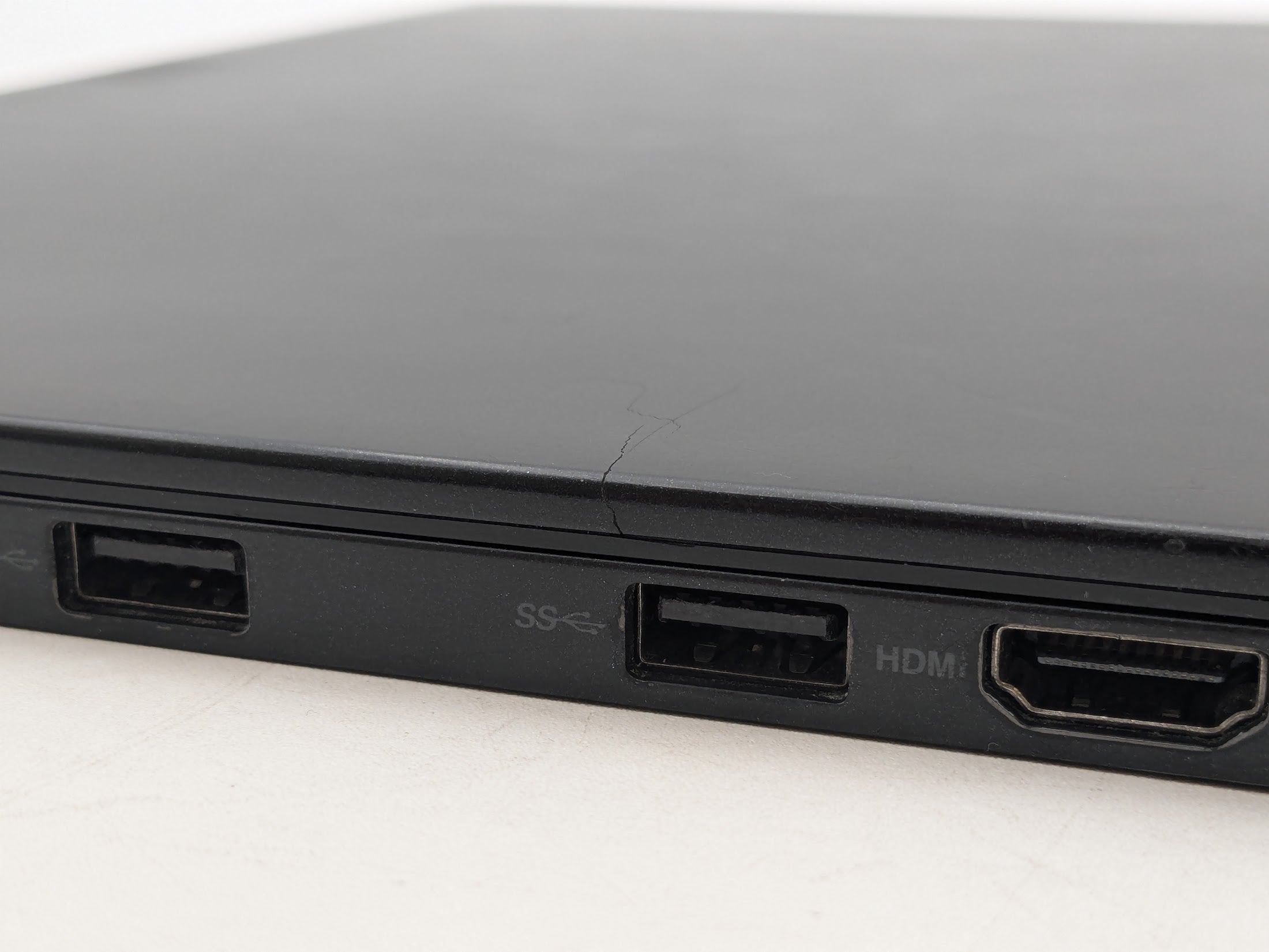 Cosmetic Defects: Interior: Display has visible scratches and keyboard imprinting, patches of uneven backlight. Moderate to heavy wear on keyboard, palmrest, and touchpad. Exterior: Scratches, scuffs, cracks, and patches of discoloration covering unit. Damaged speaker vent mesh covering. Chipped paint along edges of device.