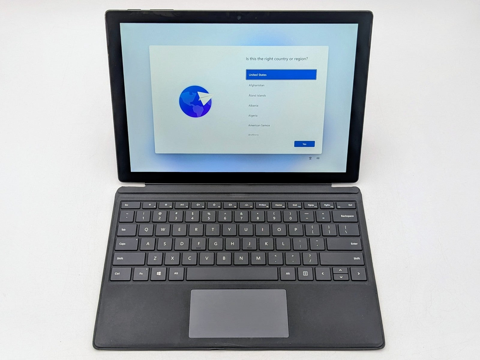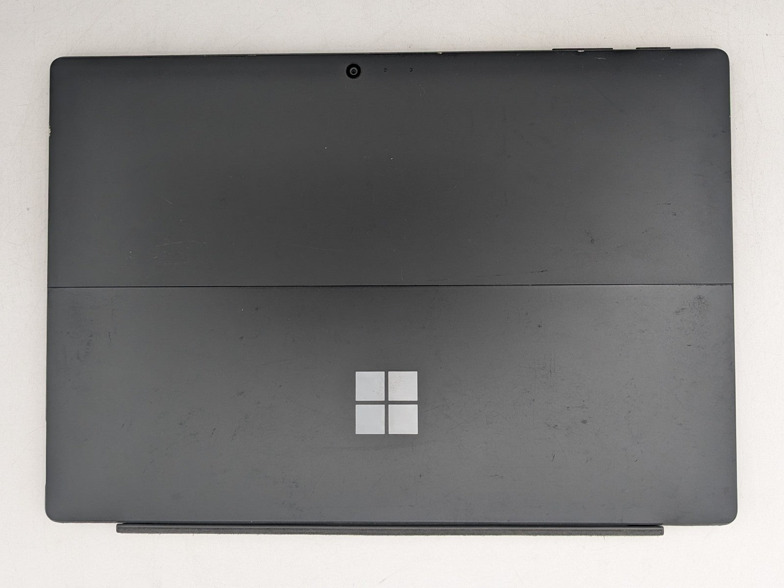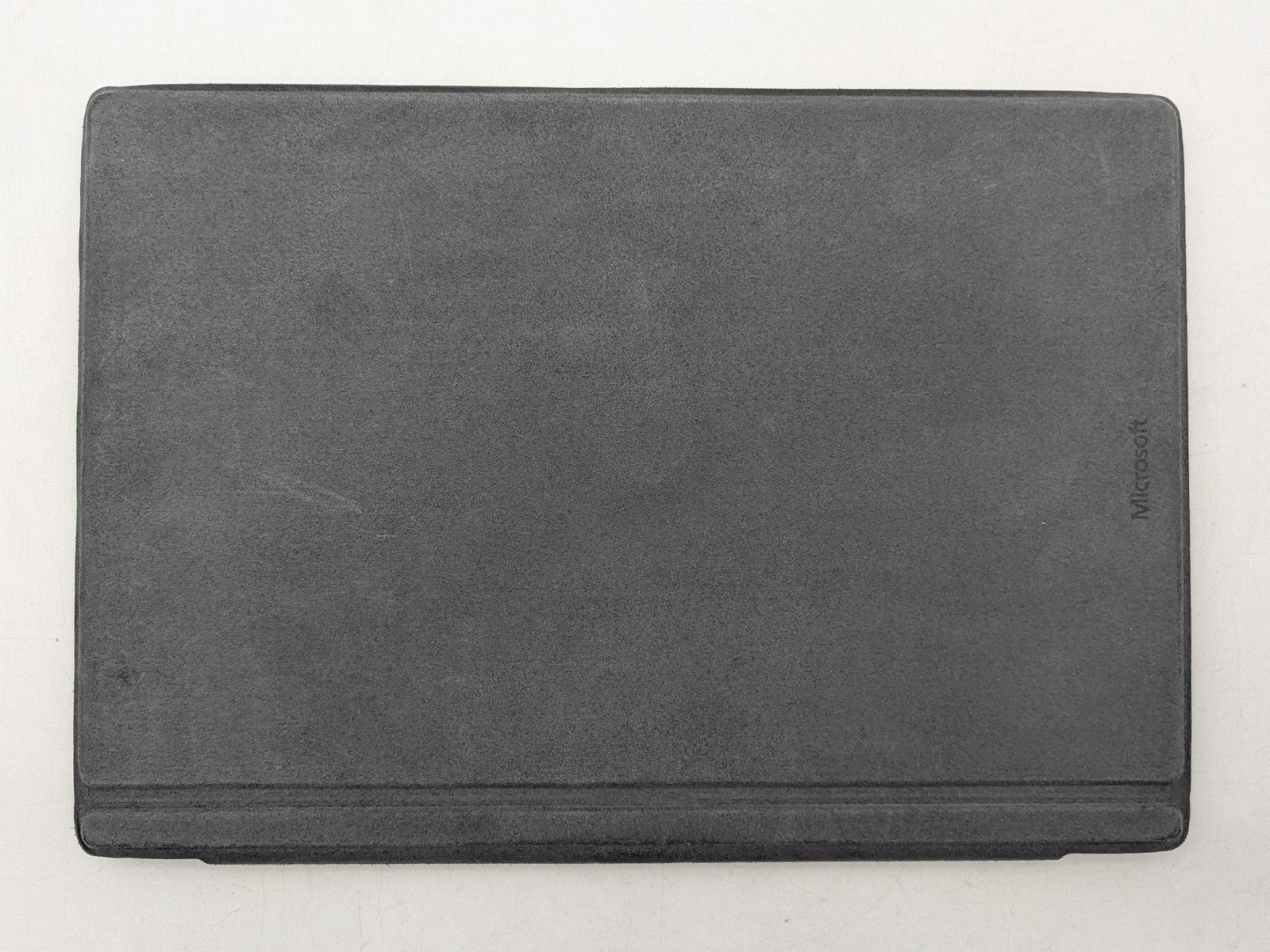 Cosmetic Defects: Interior: Display has visible scratches and keyboard imprinting. Small patches of chipped paint along edges of device. Light wear and discoloration on detachable keyboard. Exterior: Paint chips around unit. Moderate to heavy scuffs and wear on back of the tablet. Moderate wear and damage to fabric keyboard cover.