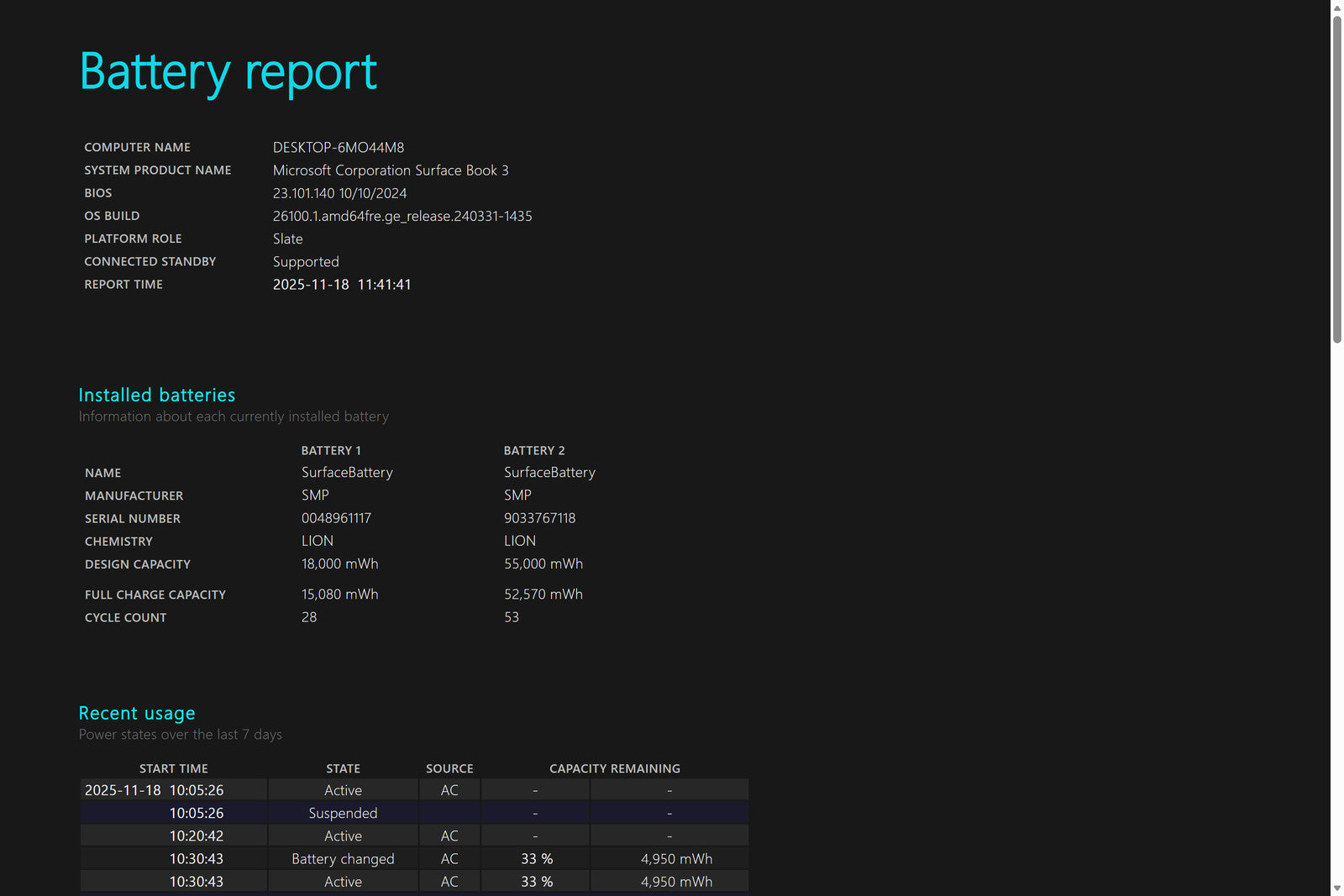 Battery Condition: Battery 1: 15,080/18,000mWh 83.78% | Battery 2: 52,570/55,000mWh 95.58%