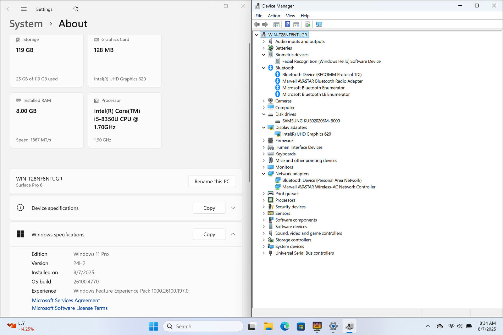SURFACE PRO 6 2-in-1 12" 2736 x 1824 Touch I5-8350U 128GB SSD 8GB W11P IRCam