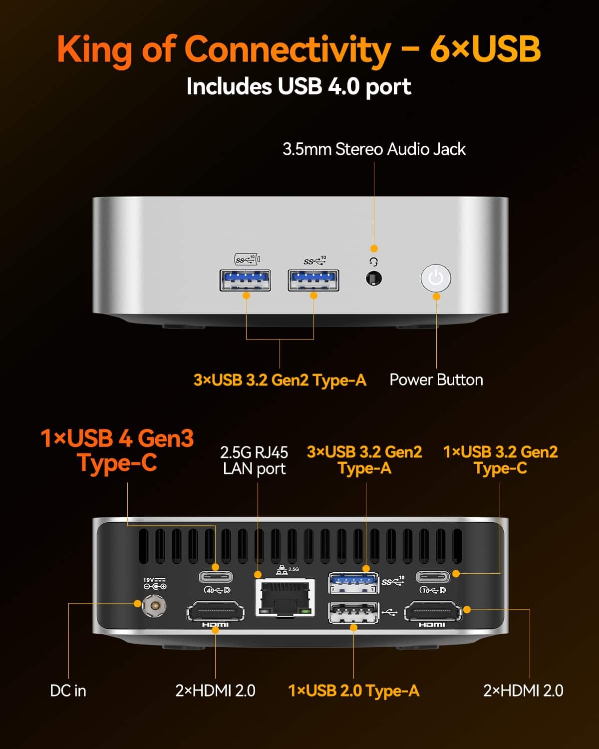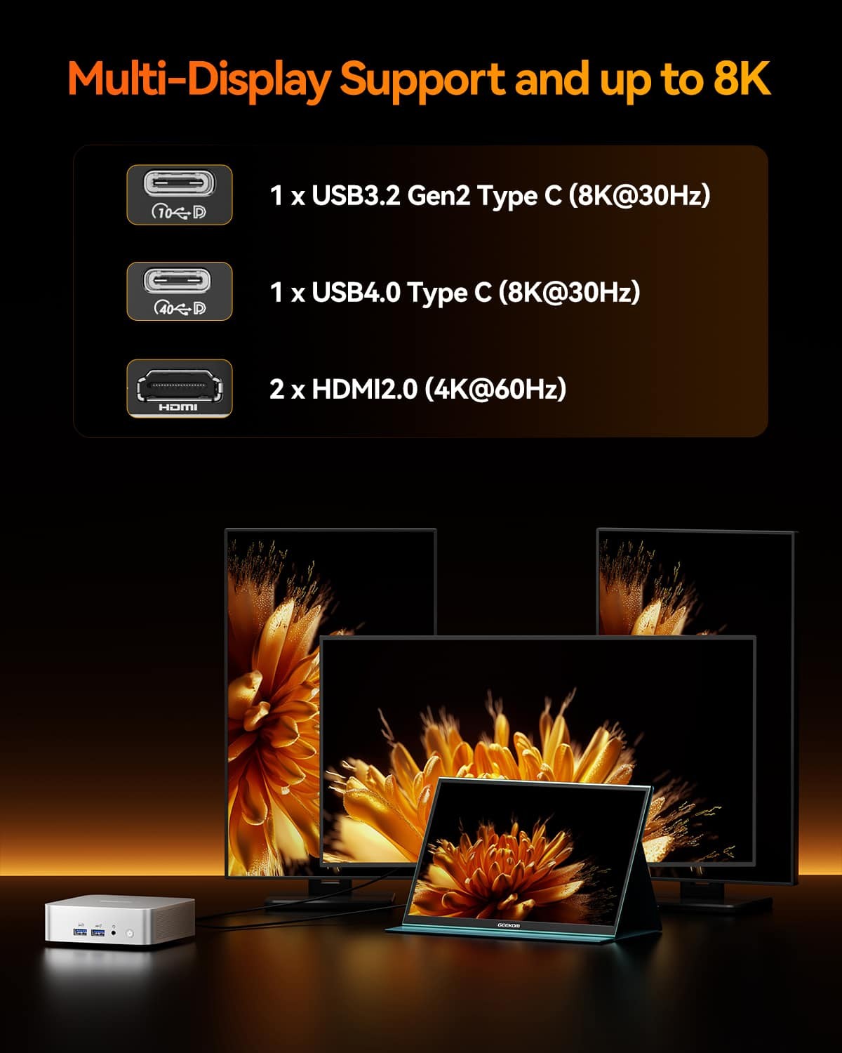 •Model: A8 AI Mini PC, AMD Ryzen 9 8945HS (up to 5.2GHz), 32GB DDR5 RAMu00262TB PCIe 4.0 SSD, Windows 11 Pro Pre-installed