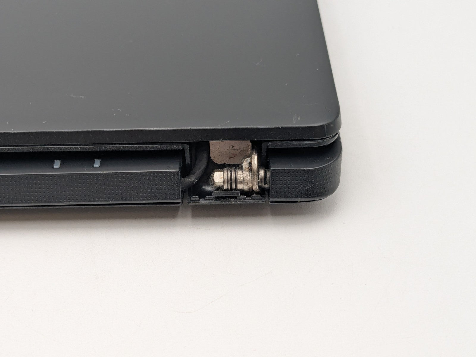 Cosmetic Defects: Interior: Display has visible scratches and keyboard imprinting. Left side hinge damaged, bezel separated from screen. Light wear on keyboard, missing "}" keycap. Visible wear and scratches on bezel, touchpad, palm rest, and around keyboard. Exterior: Visible wear and scratches on lid and bottom cover, scuffed along edges of device, missing piece of plastic on left side.