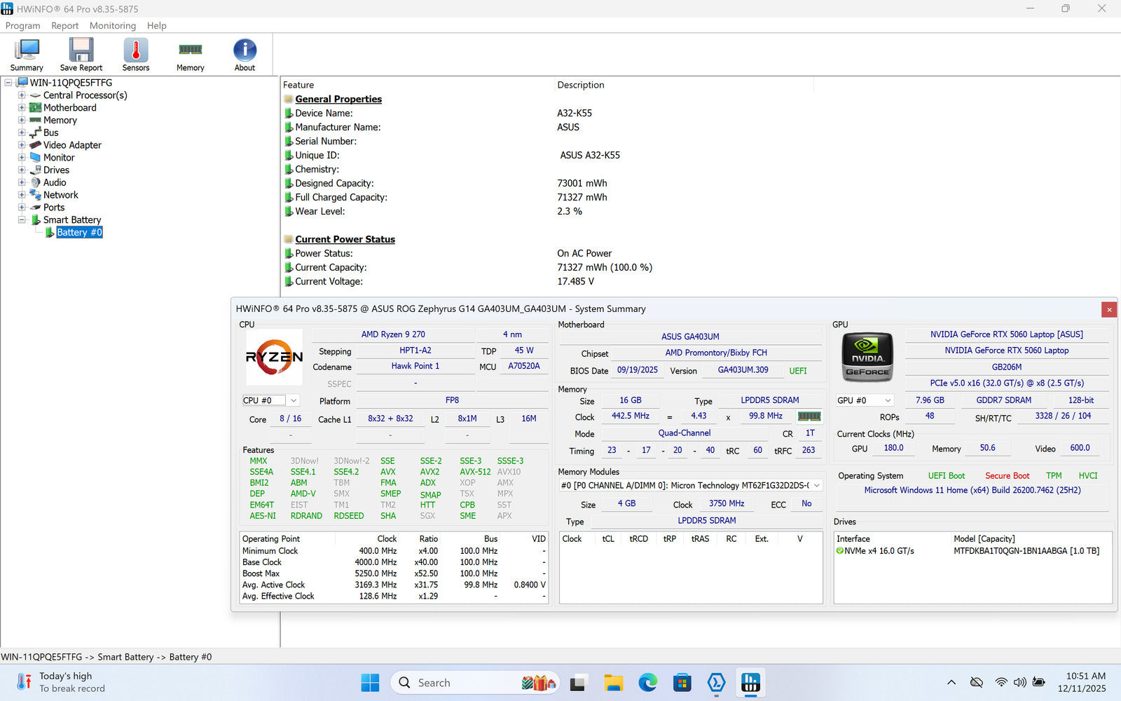 ASUS ROG Zephyrus G14 2025 14" 3K RYZEN 9 270 1TB SSD 16GB W11 RTX 5060 120Hz