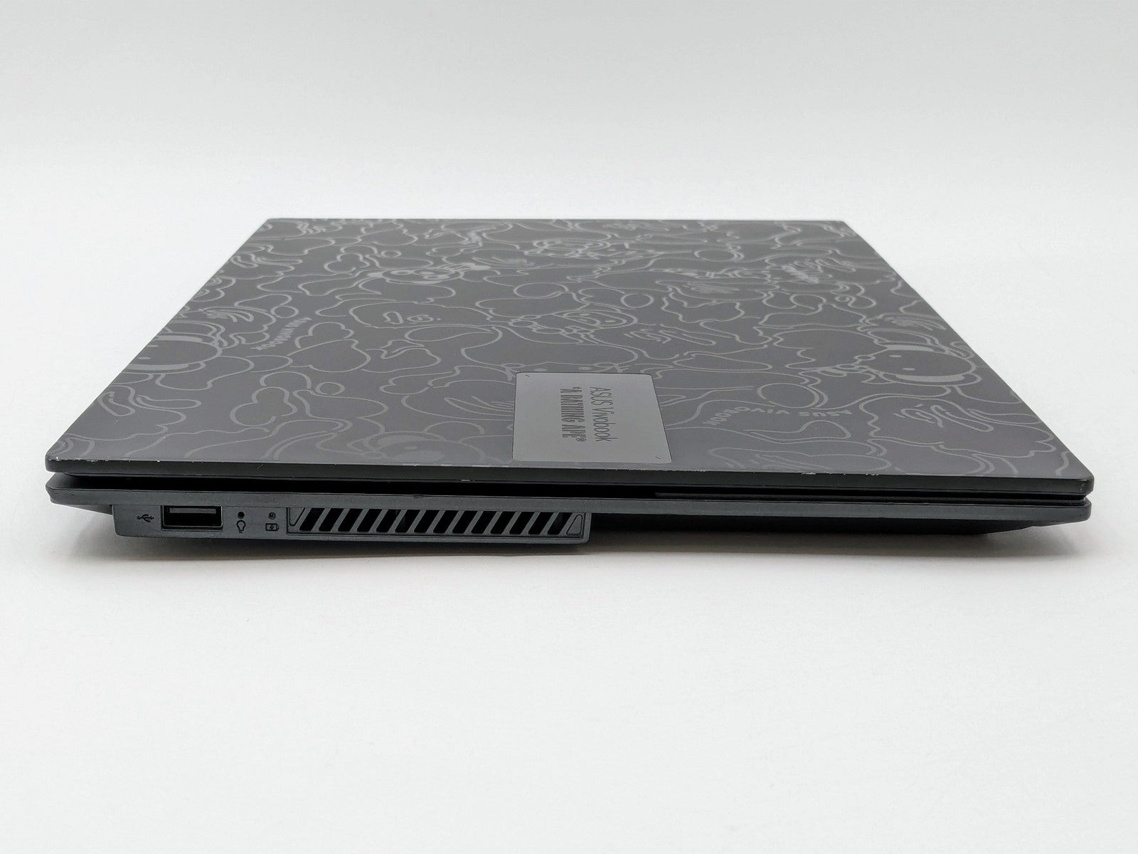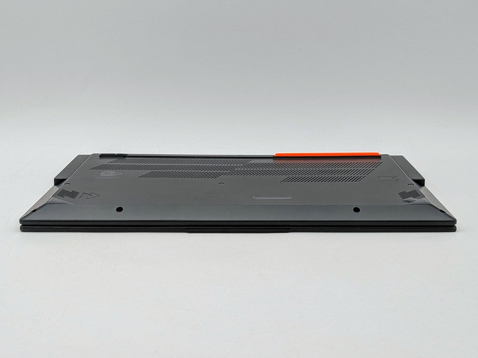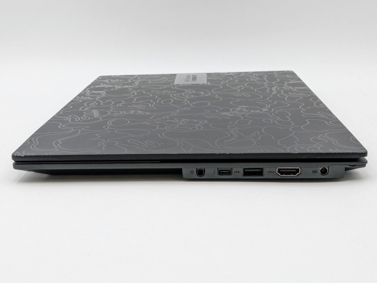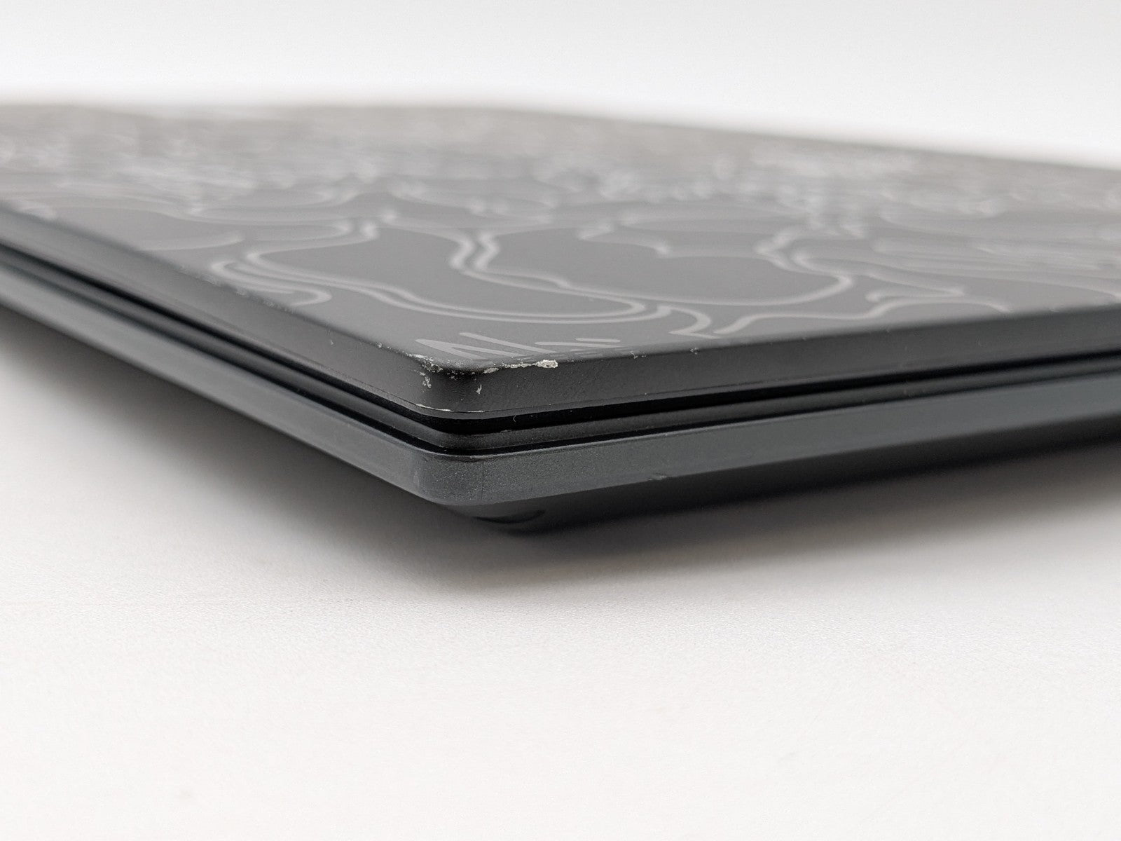 Cosmetic Defects: Interior: Display has visible scratches and keyboard imprinting. Visible wear on keyboard, touchpad, palm rest, lattice, and around keyboard. Missing rubber stabilizers on bezel. Exterior: Visible wear and scratches on lid and bottom cover, missing bottom rubber foot. Scuffed along edges.