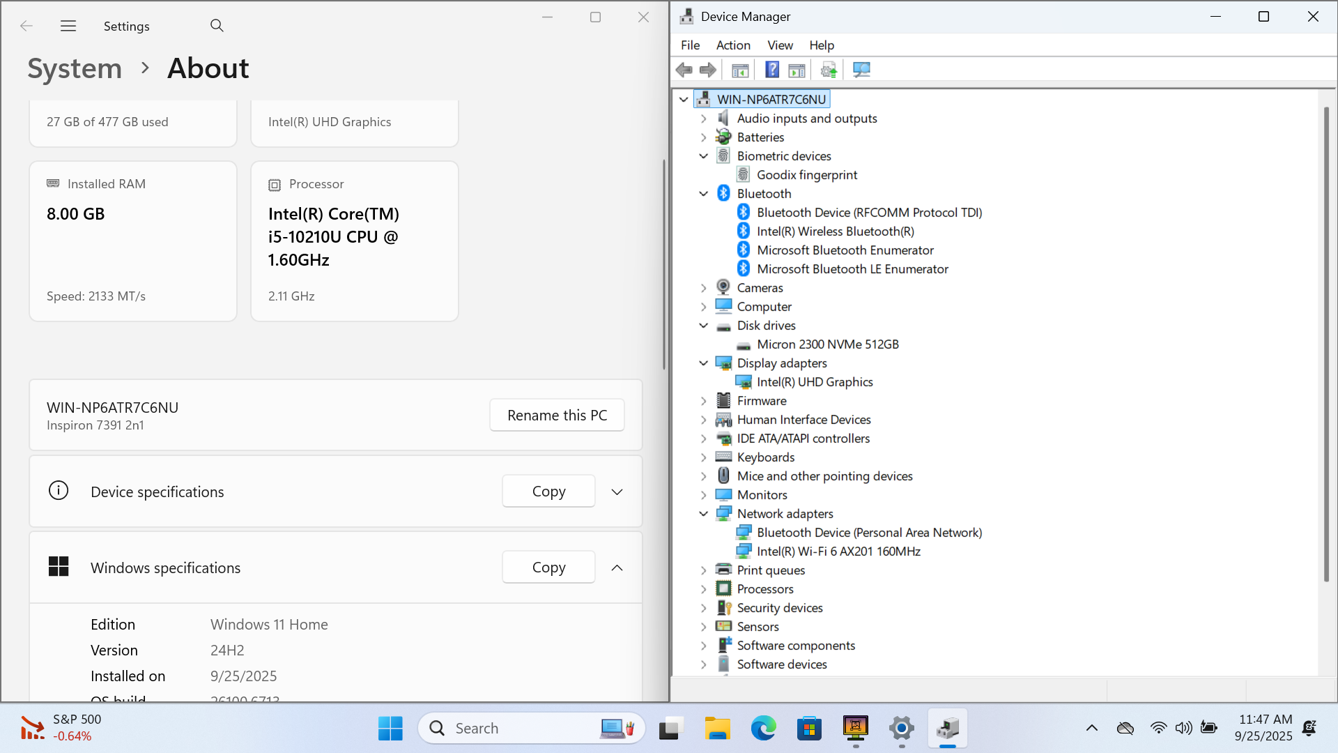 Dell Inspiron 7391 2-in-1 13" FHD Touch I5-10210U 512GB 8GB W11 Backlit FPR
