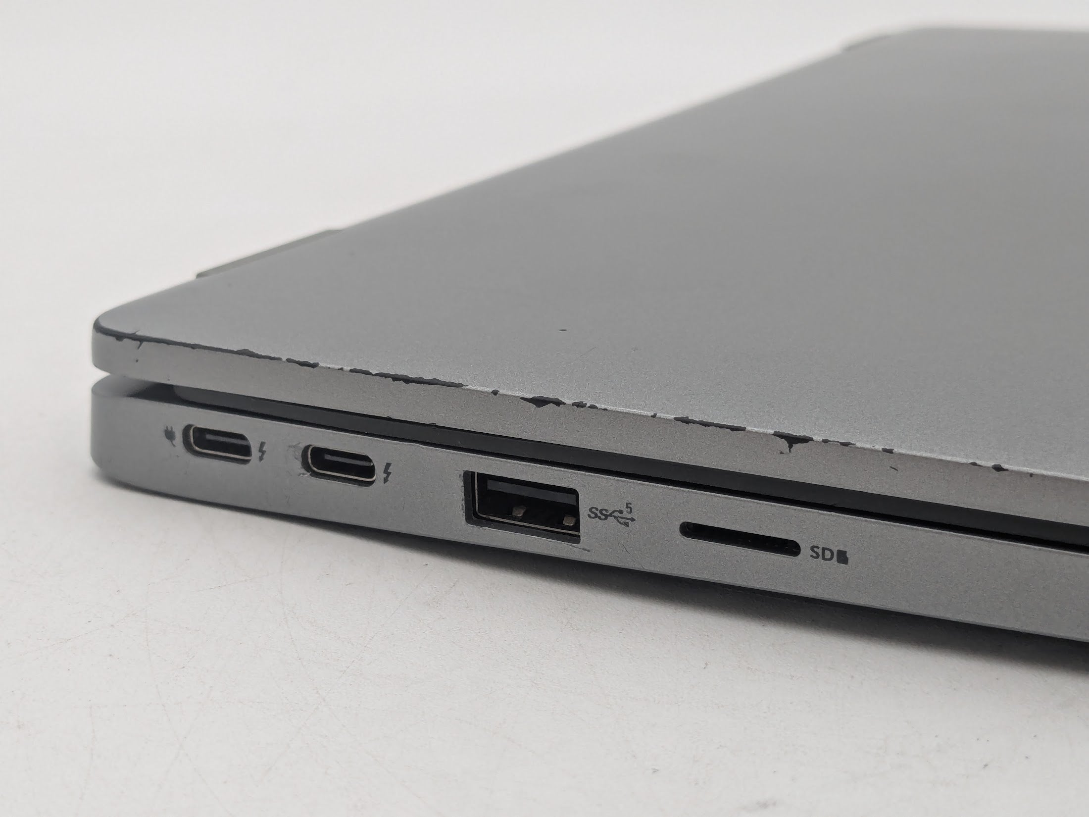 Cosmetic Defects: Interior: Heavy wear on palmrest and touchpad. Keycaps have visible wear but still legible. Exterior: Both covers have heavy wear, scratches, and chipped paint on edges.