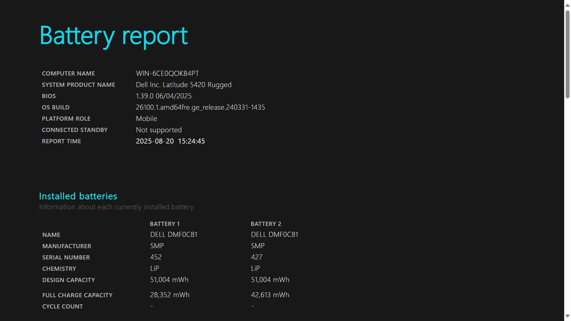 Battery Condition: Battery 1: 28,352/51,004mWh 55.59% | Battery 2: 42,613/51,004mWh 83.55%