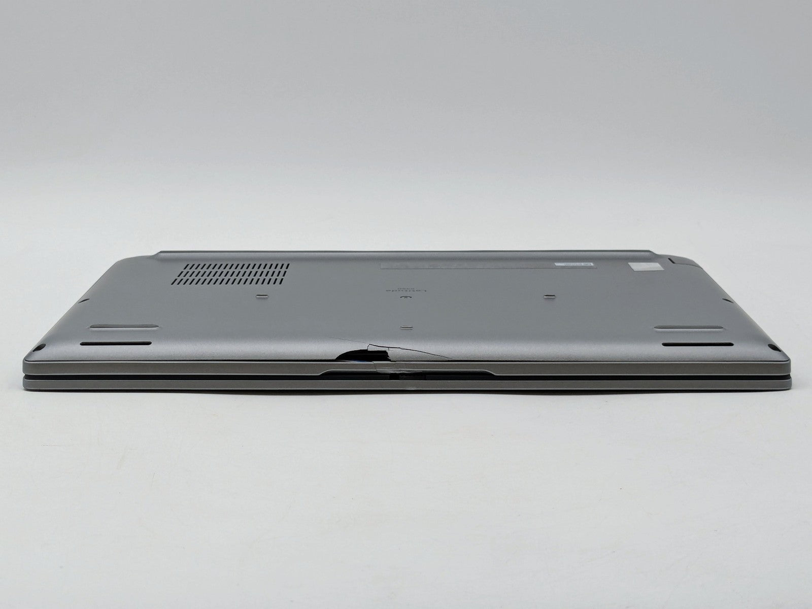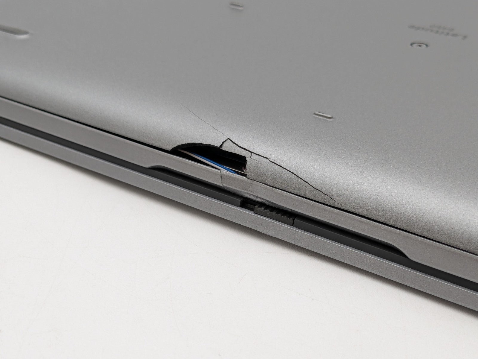 Cosmetic Defects: Interior: Superficial scratches on display, invisible during normal use. Exterior: Cracked, missing plastic on center front of the bottom cover. A small amount of damage extends to the center front edge of the palmrest and display assembly. Light scuffing and scratching across all surfaces.