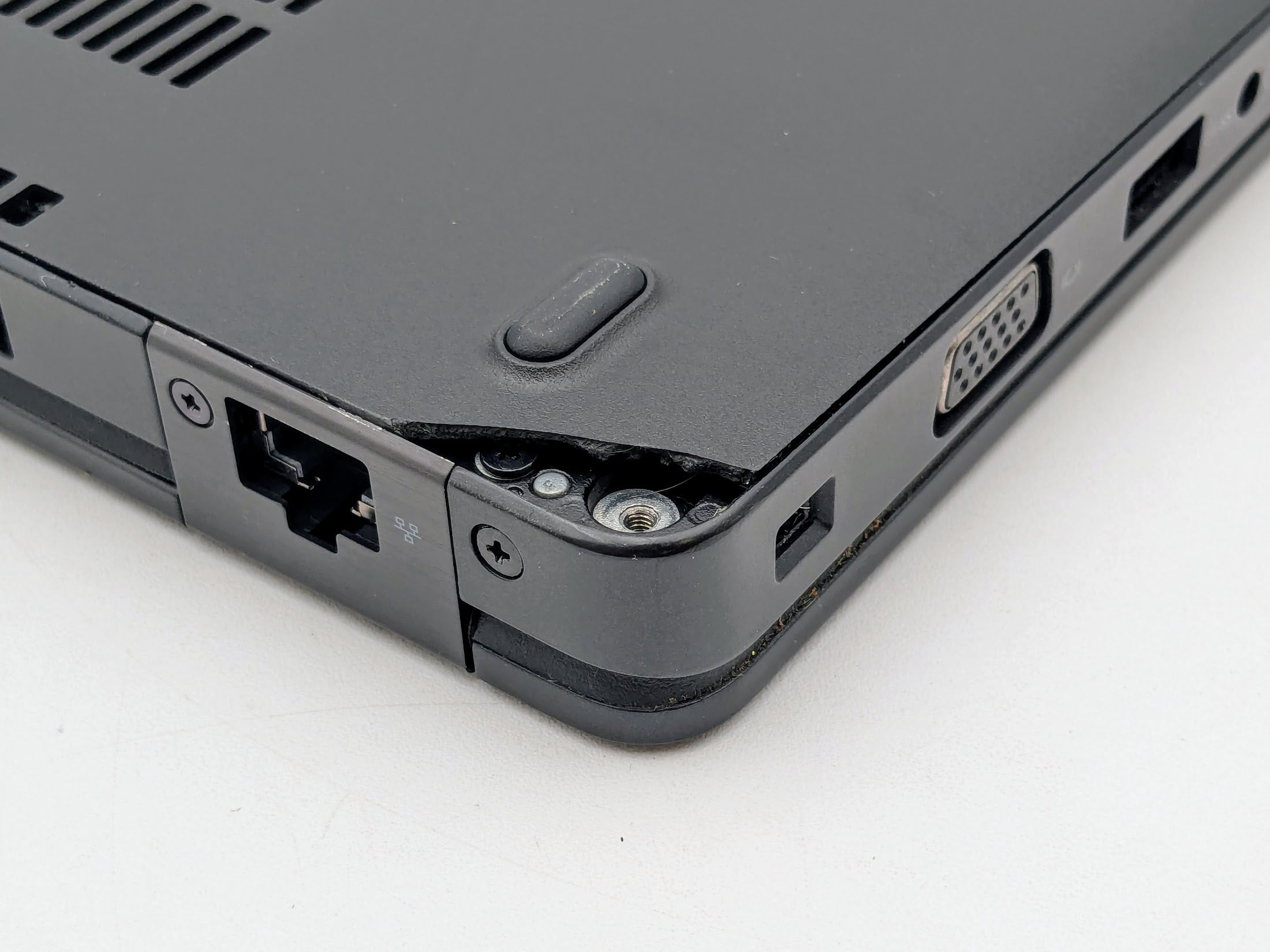 Cosmetic Defects: Interior: Display has visible scratches and keyboard imprinting. Visible wear and scratches on palm rest, visible wear on keyboard, touchpad, and mouse buttons. Exterior: Visible wear and scratches on lid and bottom cover. Wear along edges of device. Cracked on back left corner of device.