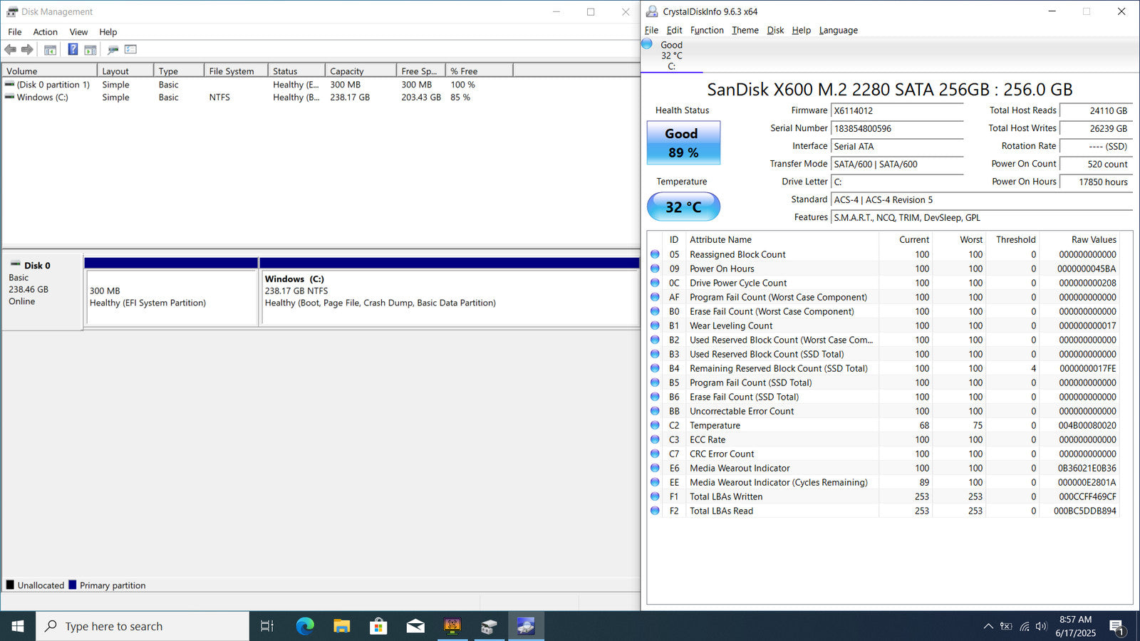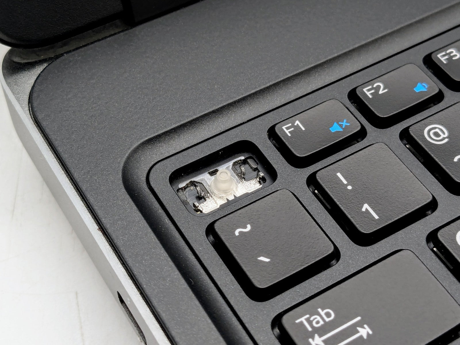 Cosmetic Defects: Interior: Missing pointing stick cap, 1 keycap. Moderate wear on touchpad, keyboard, and palmrest assembly. Exterior: Patch of chipped paint on bottom cover. Several scratches, patches of discoloration across device. Small dents and dings along edges of device.