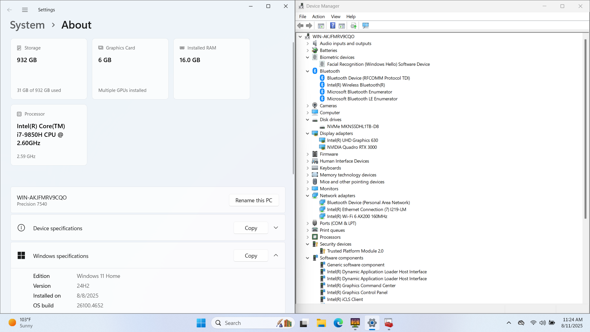 Dell Precision 7540 15" FHD I7-9850H 1TB SSD 16GB W11 Quadro RTX 3000 IRCam