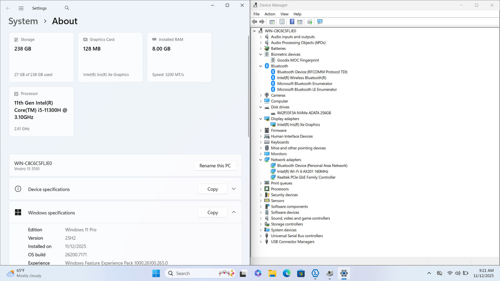 DELL Vostro 15 5510 15" FHD I5-11300H 256GB SSD 8GB W11P Webcam Backlit FPR