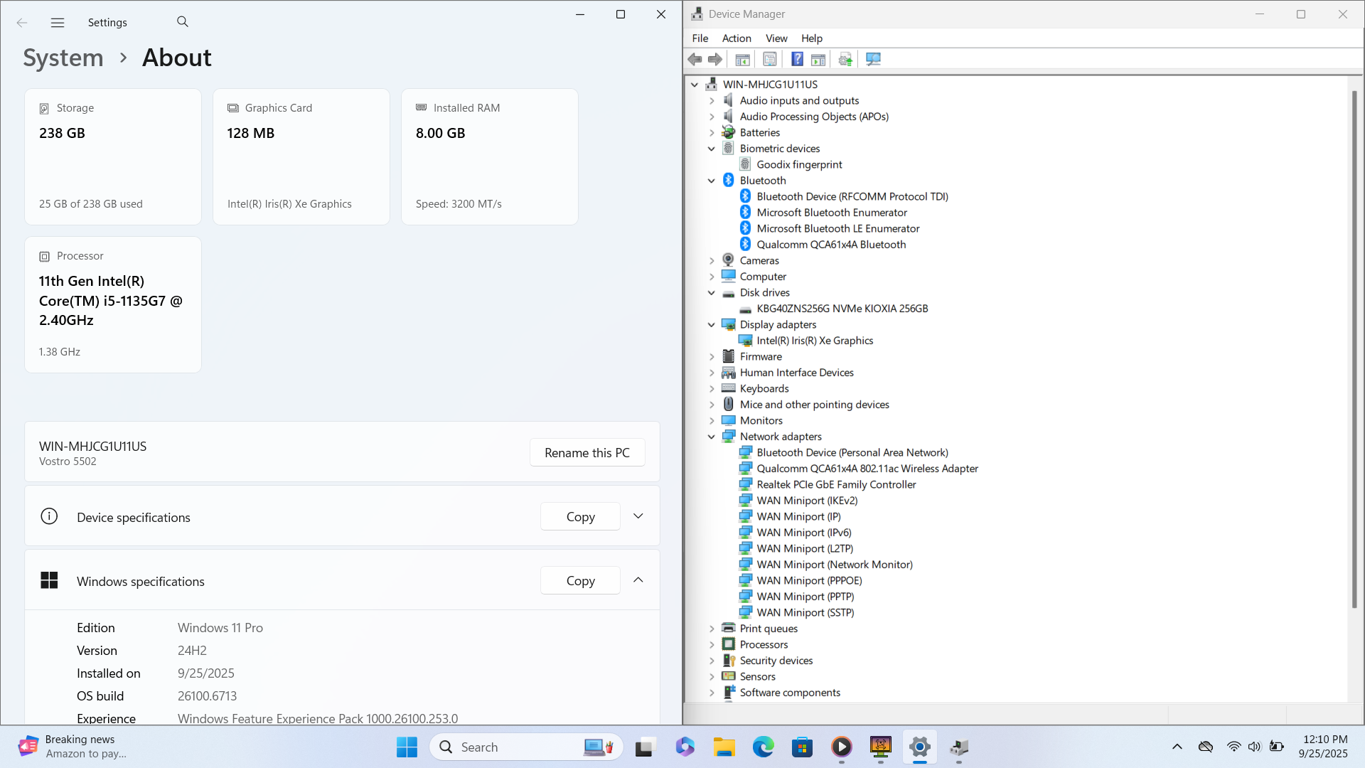 DELL Vostro 5502 15" FHD I5-1135G7 256GB 8GB W11P Webcam Backlit FP Reader