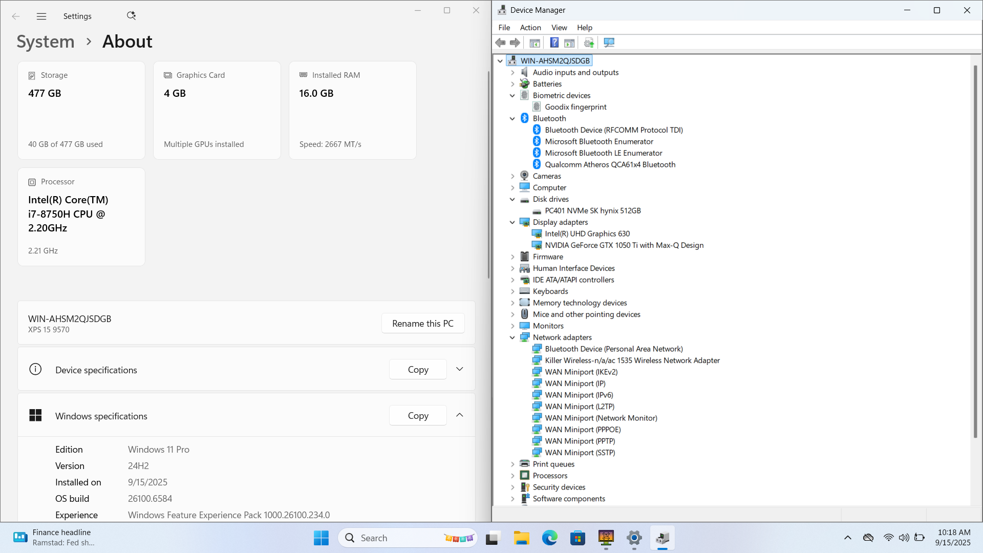 Dell XPS 15 9570 15" FHD I7-8750H 512GB SSD 16GB W11P GeForce GTX 1050 Ti *READ*