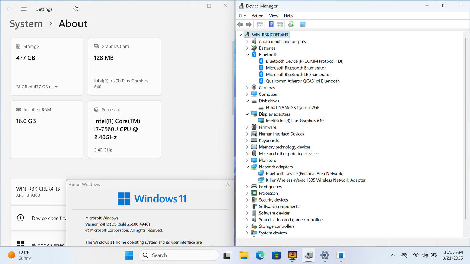 Dell XPS 9360 13" QHD+ Touch I7-7560U 512GB SSD 16GB W11 Webcam Backlit