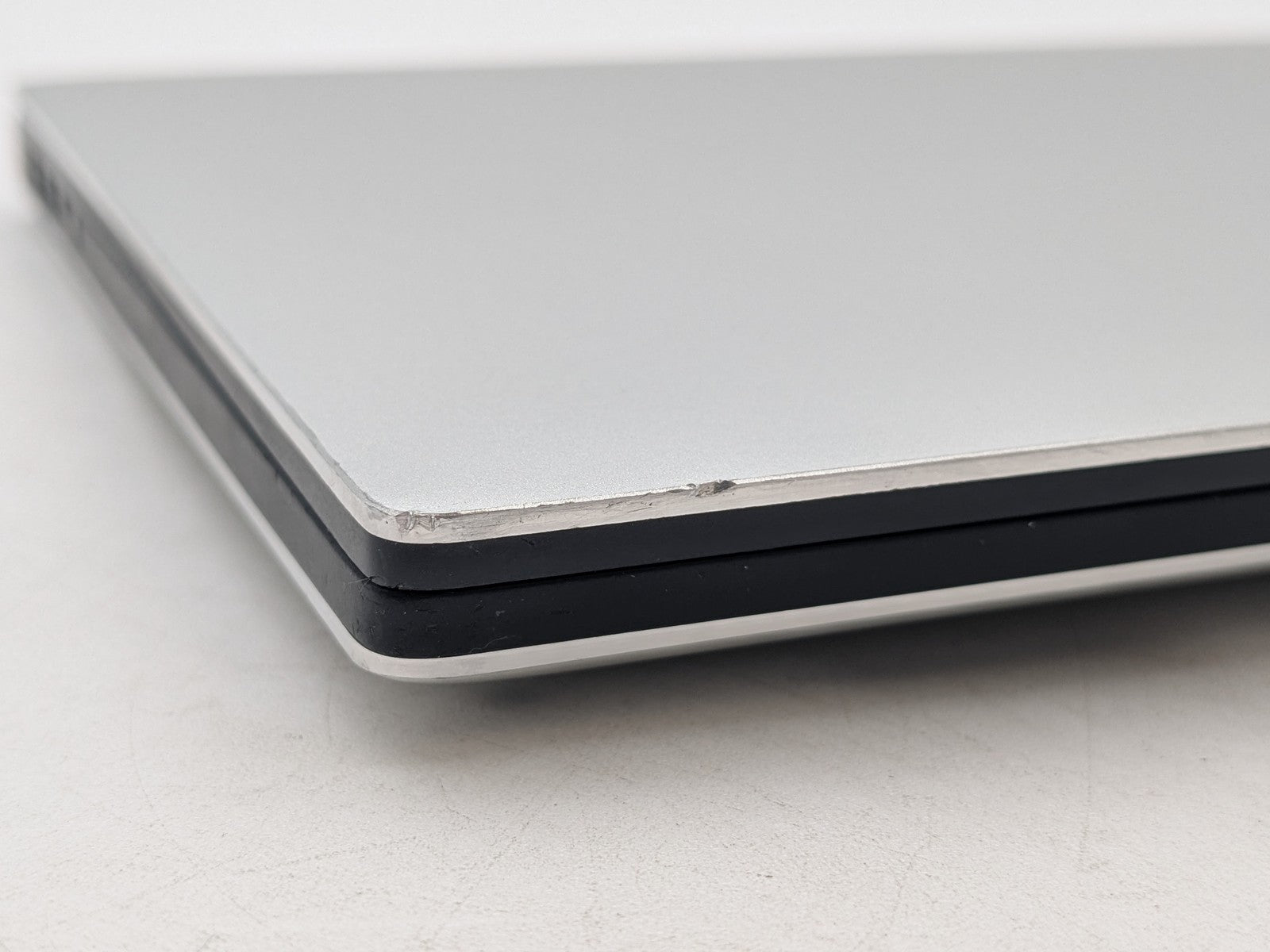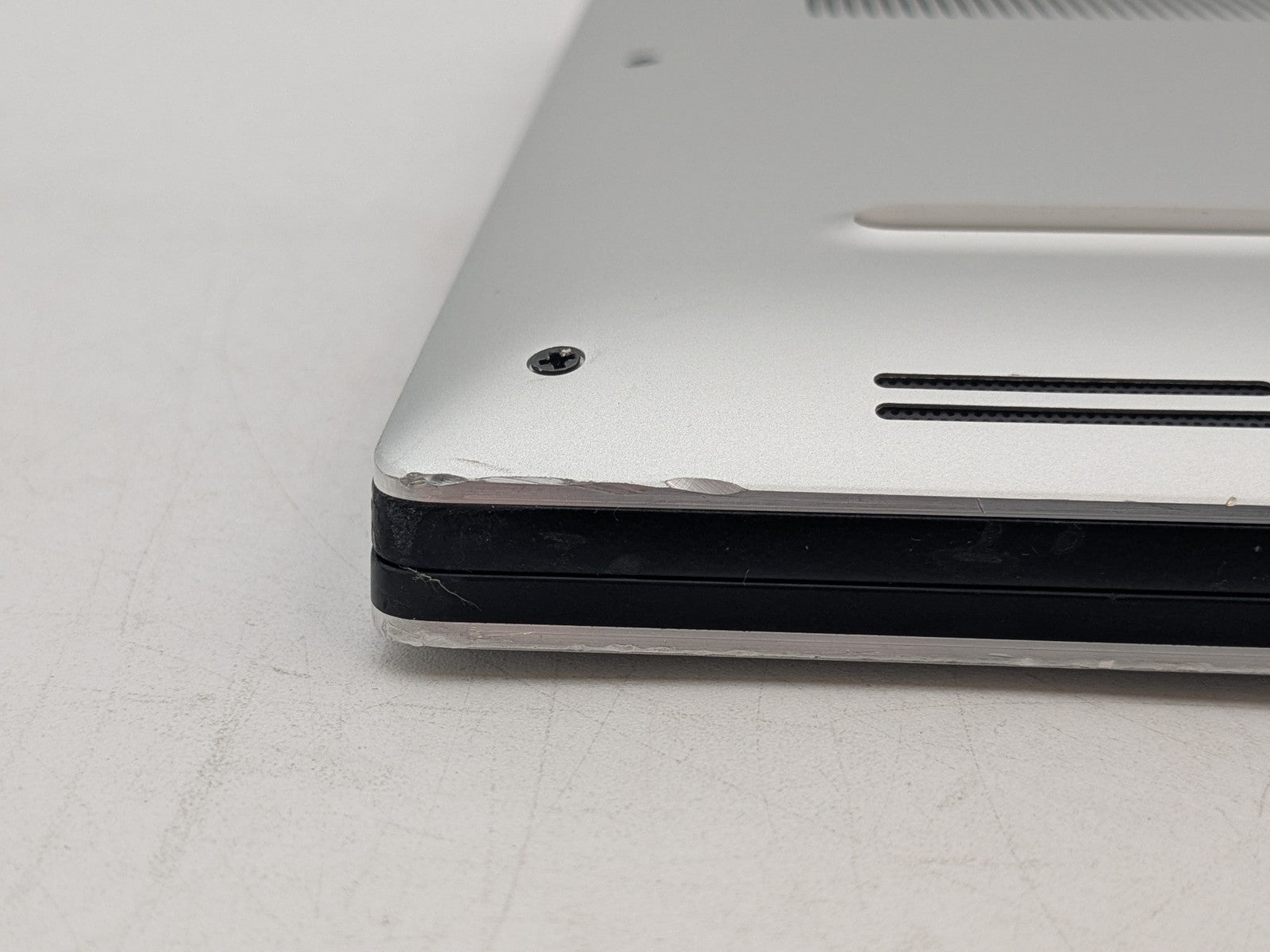 Cosmetic Defects: Interior: Liquid damage/light spots on display. Light wear, patches of discoloration on keyboard, touchpad, and bezel. Visible wear on keyboard lattice and palm rest. Exterior: Light wear and visible scratches on lid, visible wear and scratches on bottom cover. Moderate scuffing and small dents along edges of device. Non-original black screws installed on bottom cover.
