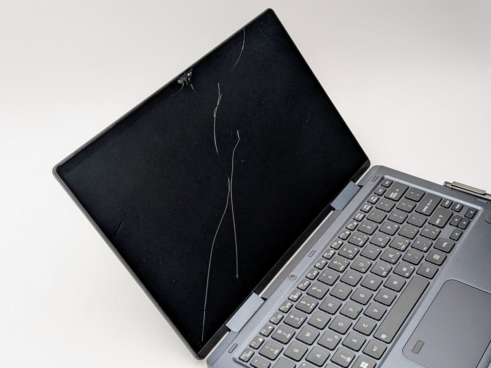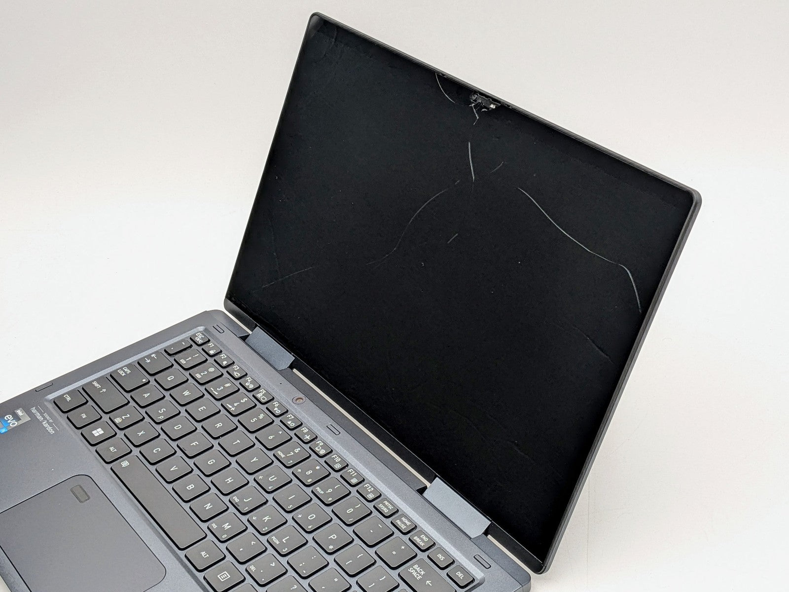 Cosmetic Defects: Interior: Display is badly cracked but functions. Visible scuffs on palmrest. Exterior: Minor scratches, dents, and moderate scuffs on top and bottom cover. Heavy wear on rubber feet.