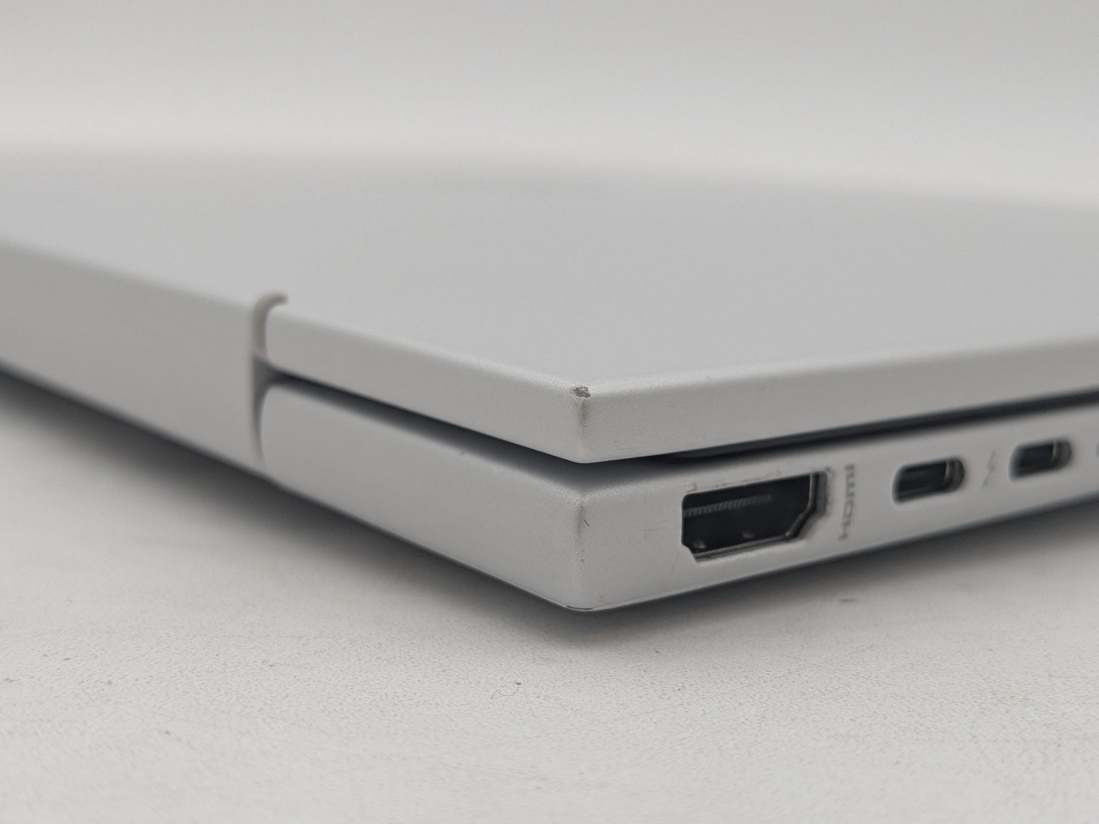 Cosmetic Defects: Interior: Chips and marks around keyboard. Small scratches on display, visible during normal use. Exterior: Scratches on top of unit and on emblem. Chip on back left corner. Chips and light scratches on bottom and border of unit.