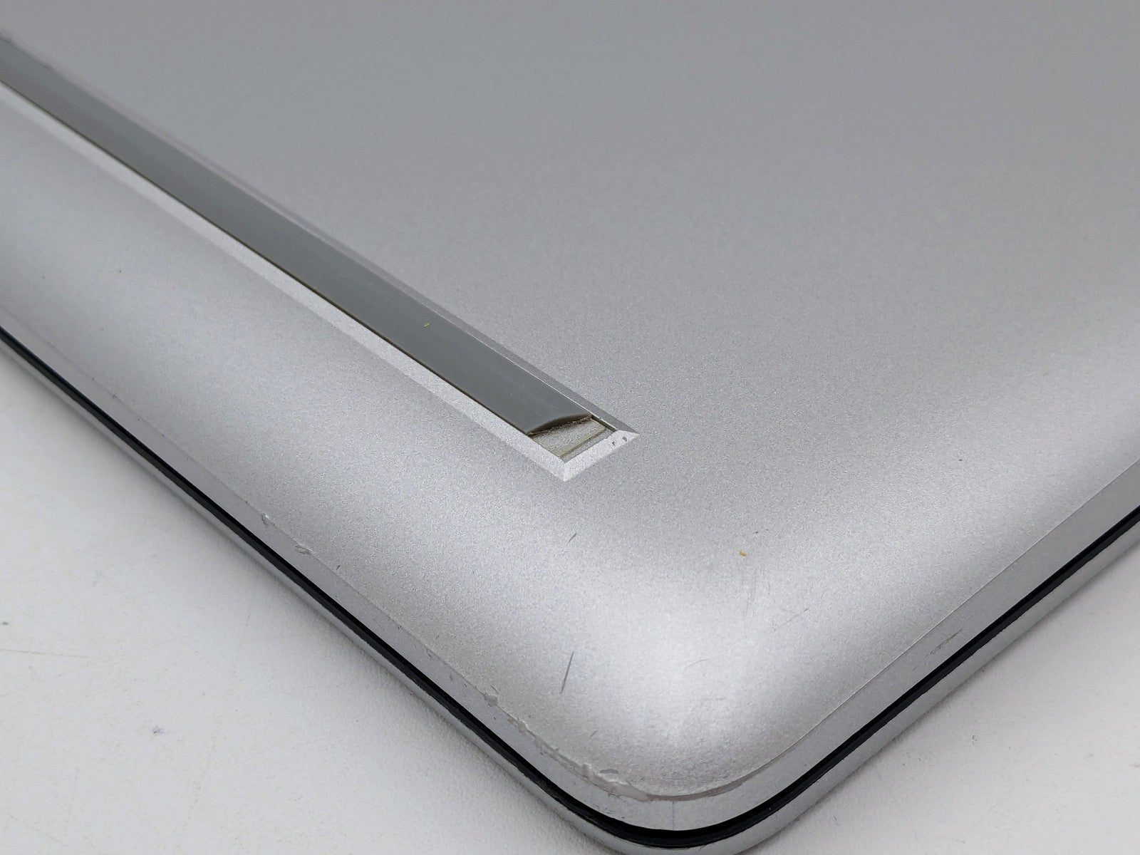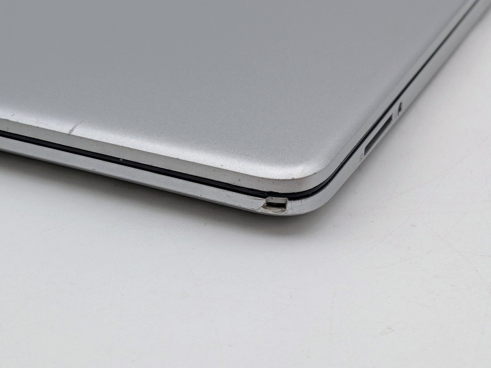Cosmetic Defects: Interior: Display has visible scratches and keyboard imprinting. Light wear on keyboard and touchpad. Visible wear and scratches on palm rest, cracked on bottom right corner. Exterior: Light wear and visible scratches on lid and bottom cover, scuffed around edges of device. Bottom rubber feet damaged.