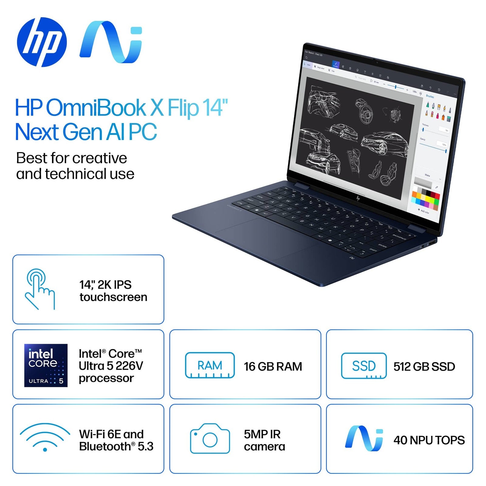 •title: HP - OmniBook X Flip 2-in-1 - Copilot+ PC - 14" 2K Touch-Screen Laptop - Intel Core Ultra 5 226V - 16GB Memory - 512GB SSD - Atmospheric Blue