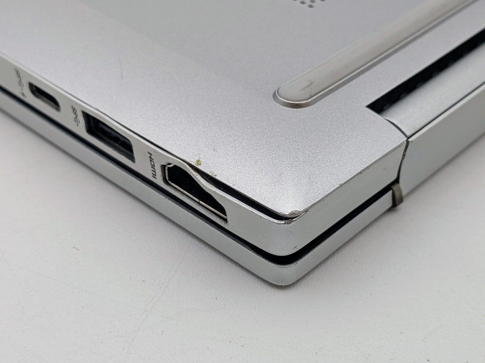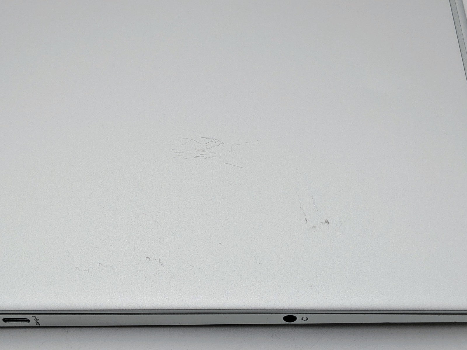 Cosmetic Defects: Interior: Marks on display, slightly visible during normal use. Light wear on keyboard, touchpad, and palm rest. Exterior: Visible wear and scratches on lid, large scratch on bottom cover, wear, scuffs/scratches, and dents around edges of device.