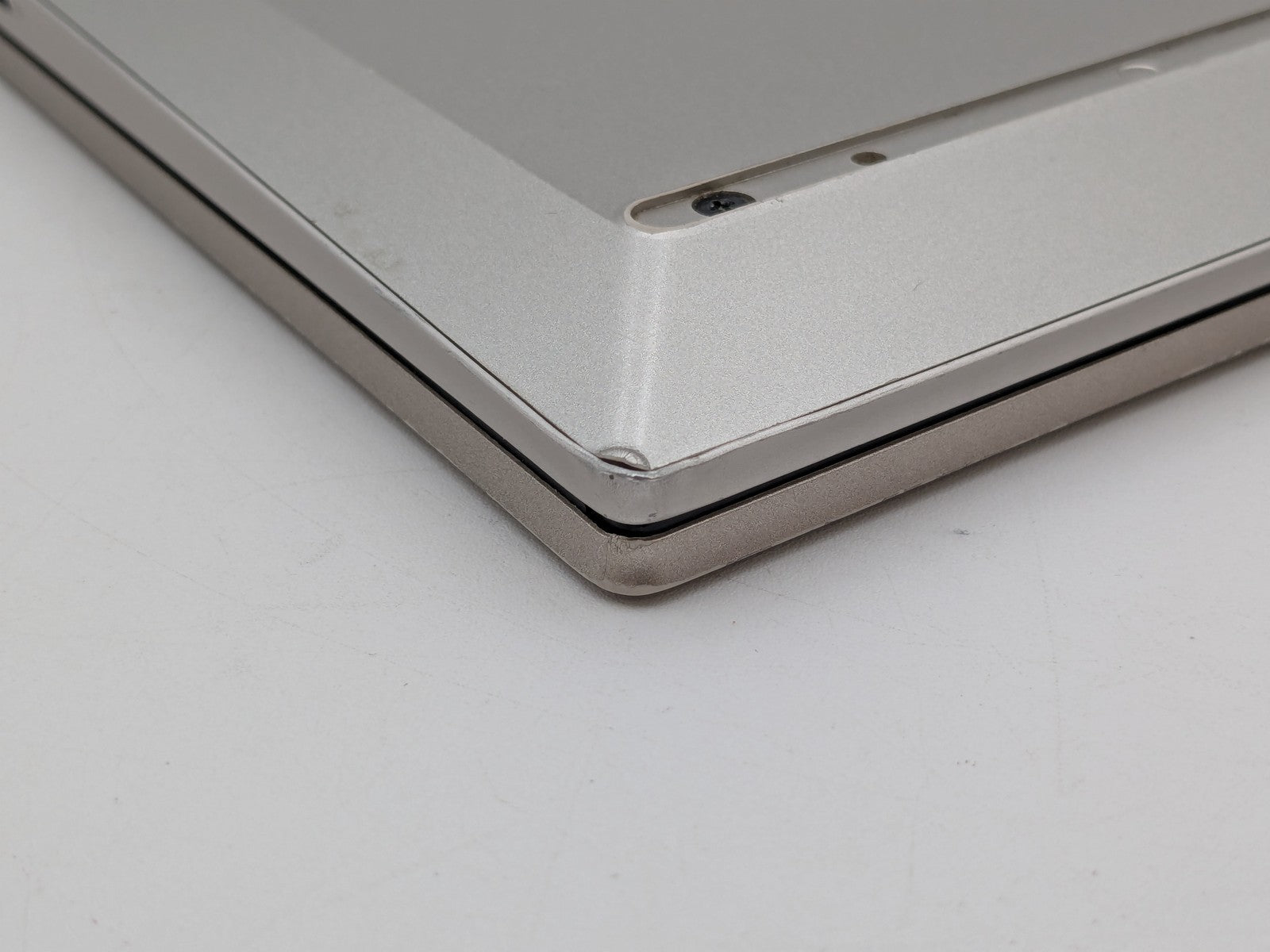 Cosmetic Defects: Interior: Display has visible scratches and keyboard imprinting. Bezel is missing pieces from corners. Exterior: Both covers have visible scuffs, scratches, and dented corners. Top cover has large crack in left side. Bottom cover is missing both rubber feet.