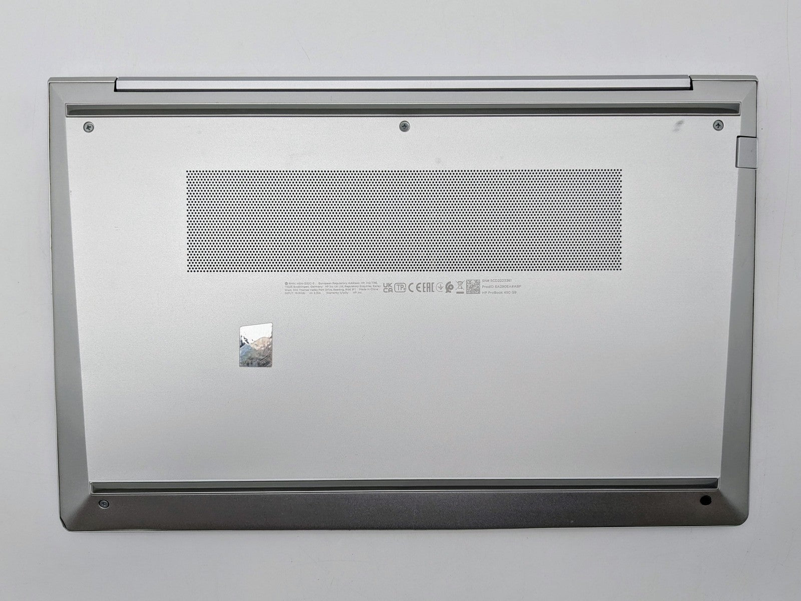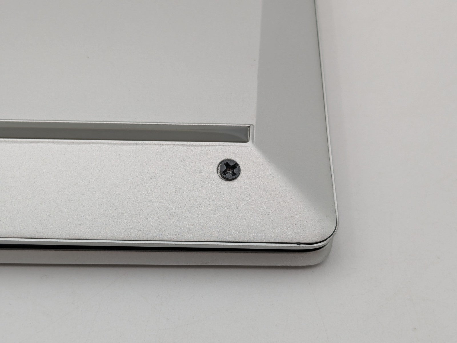 Cosmetic Defects: Interior: Display has visible scratches and keyboard imprinting. Visible wear on keyboard and bezel. Light wear on palm rest and touchpad. Small scratch left of keyboard. Exterior: Visible wear, scratches, and small dents on lid and bottom cover, scuffed along edges of device. Bottom cover screw missing, wrong-sized screw jammed in its place.