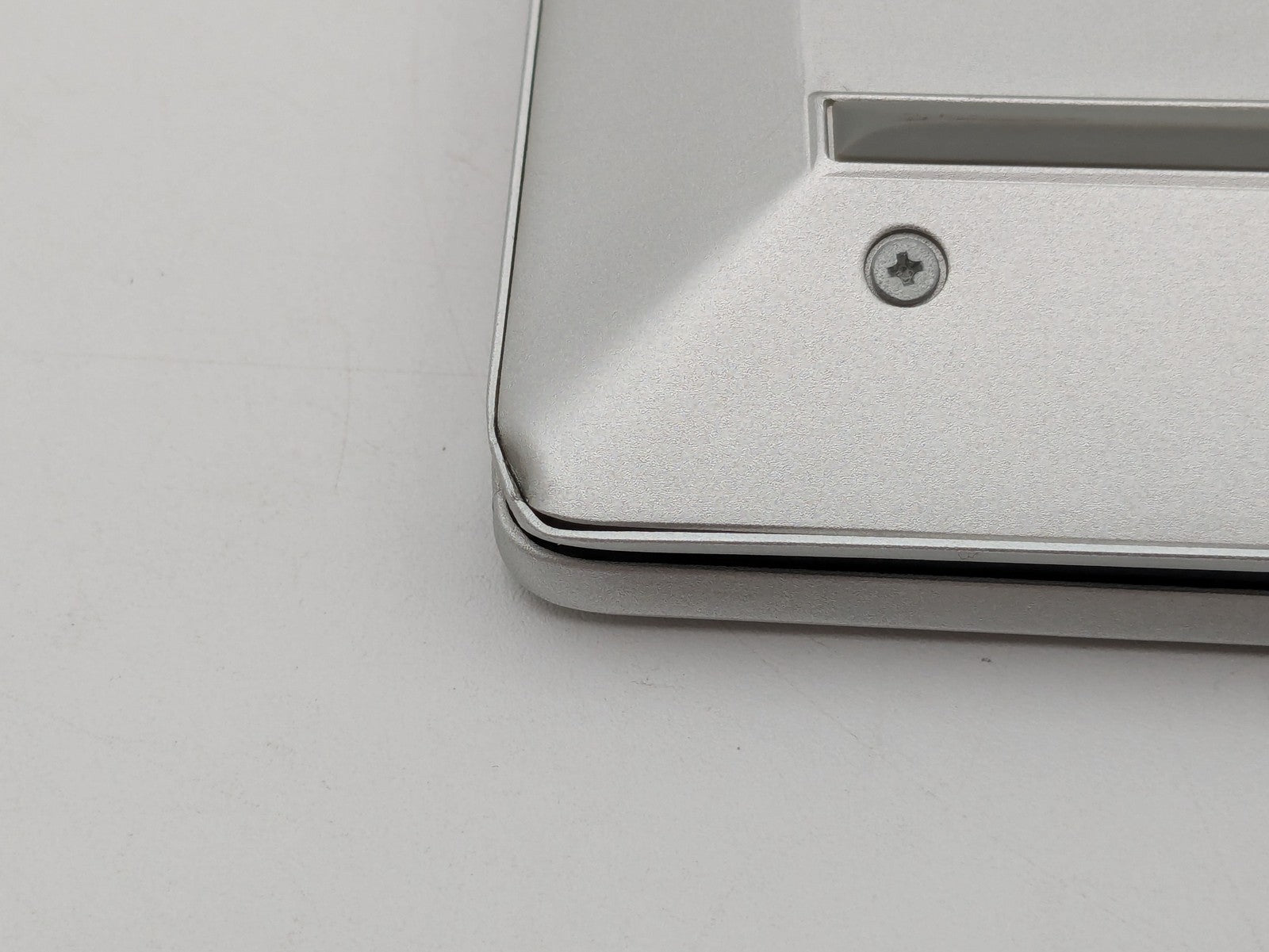 Cosmetic Defects: Interior: Display has visible scratches and keyboard imprinting. Visible wear on keyboard and bezel. Light wear on palm rest and touchpad. Small scratch left of keyboard. Exterior: Visible wear, scratches, and small dents on lid and bottom cover, scuffed along edges of device. Bottom cover screw missing, wrong-sized screw jammed in its place.