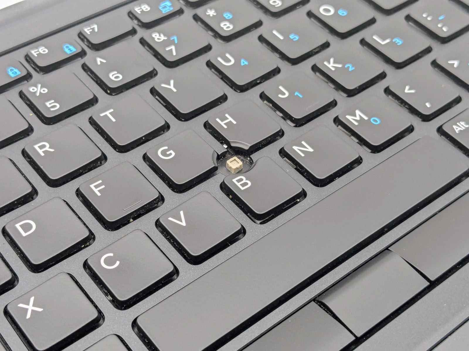 Cosmetic Defects: Missing pointing stick cap. Moderate wear and scuffing on palmrest. Scratching, patch of discoloration on bottom cover. Deep scratch on one rear hinge cover.