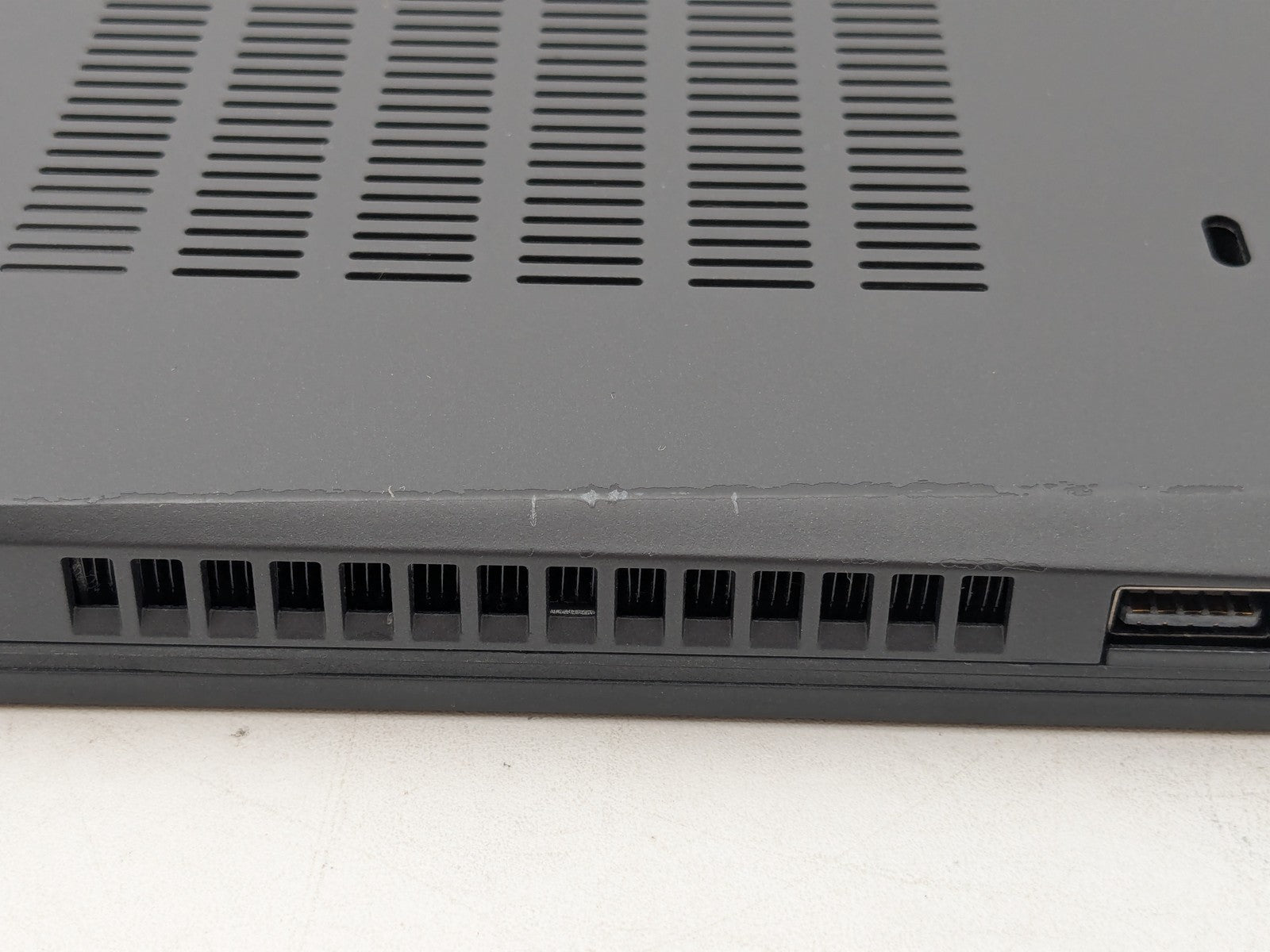 Cosmetic Defects: Interior: Display has a light spot, as well as visible scratches and keyboard imprinting. Visible wear on bezel, keyboard, touchpad, palm rest, and around keyboard. Exterior: Moderate wear and visible scratches on lid, light wear and visible scratches on bottom cover. Wear/scratches along edges of device.