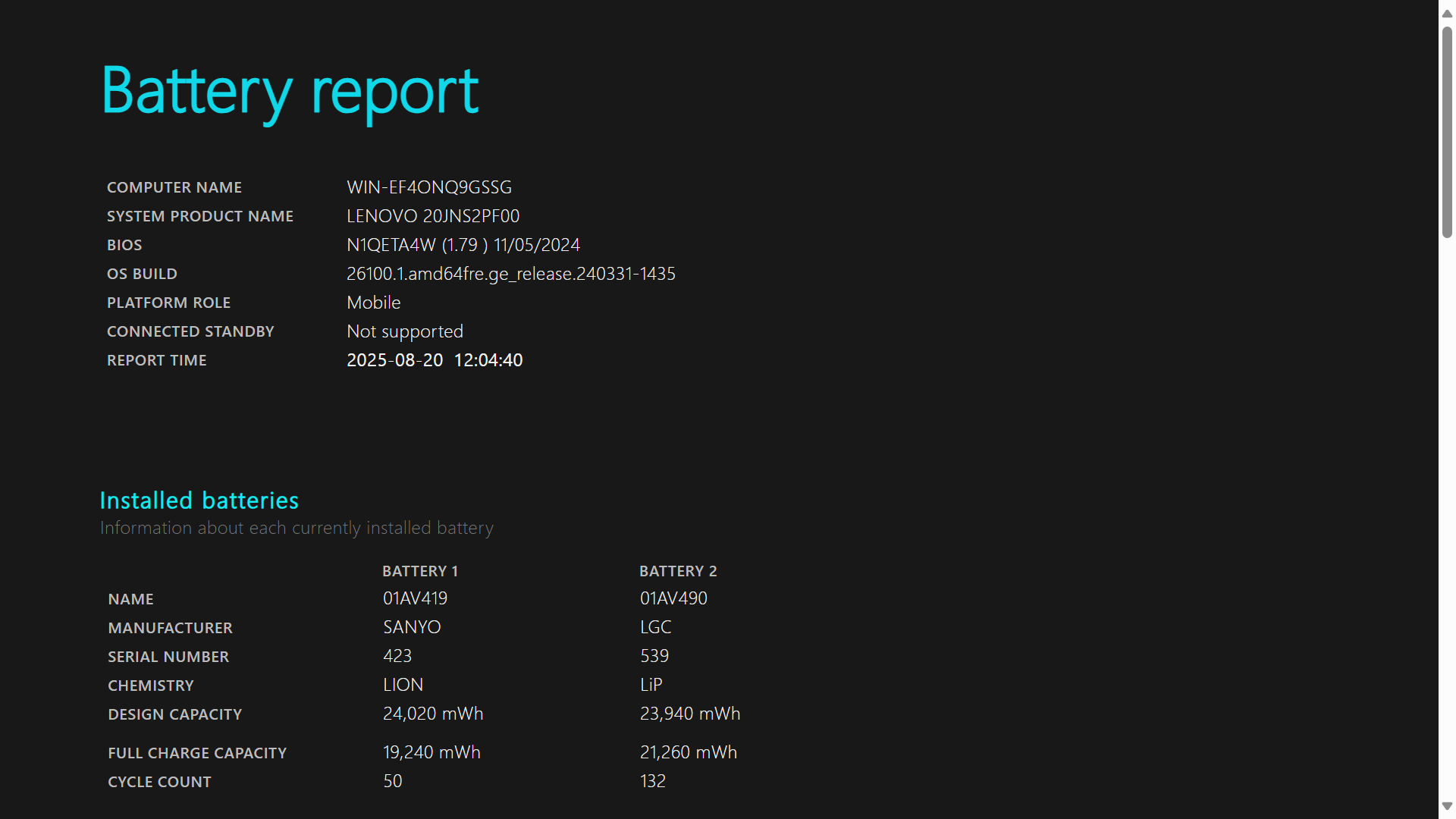 Battery Condition: Battery 1: 19,240/24,020mWh 80.10% | Battery 2: 21,250/23,940mWh 88.76%