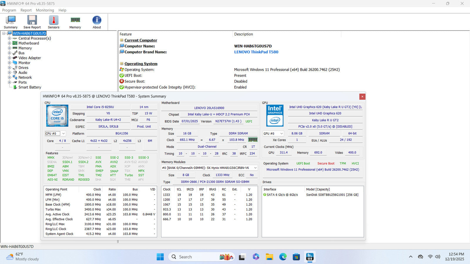LENOVO ThinkPad T580 15" FHD Touch I5-8250U 256GB SSD 16GB W11P Webcam *READ*