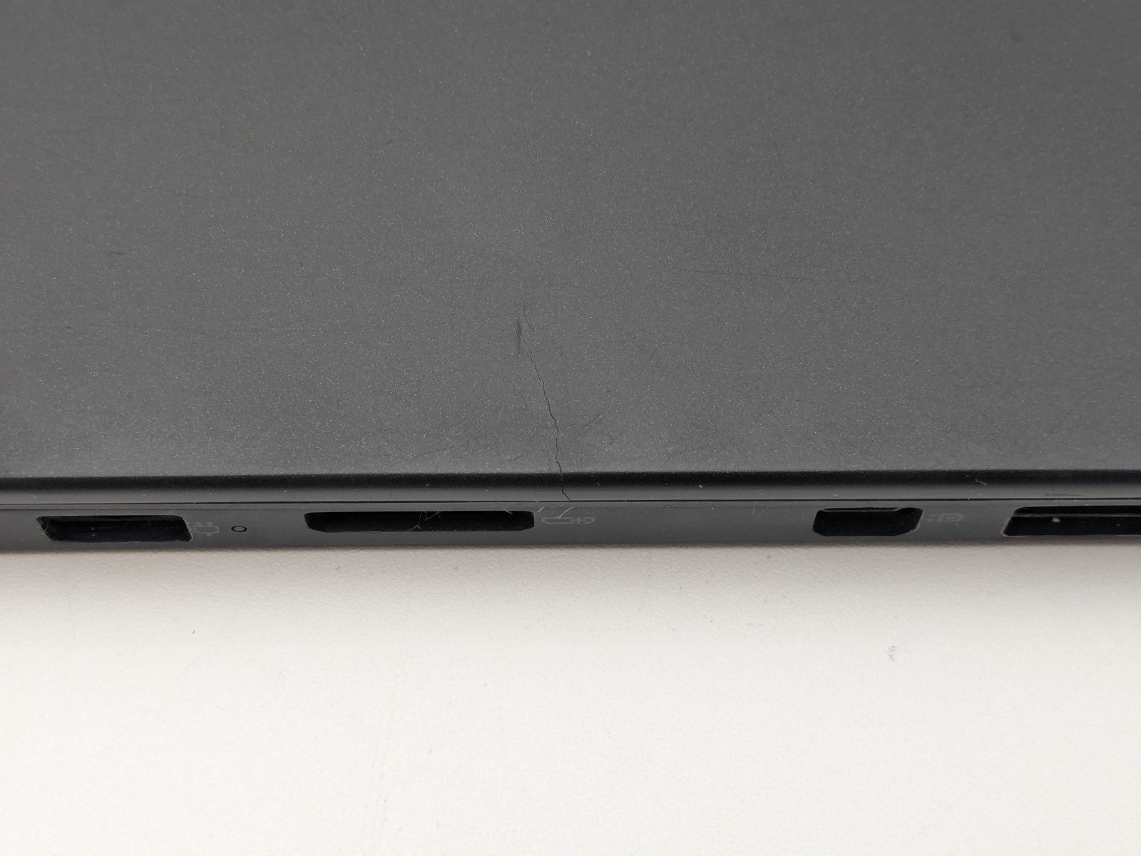 Cosmetic Defects: Interior: Display has visible scratches and keyboard imprinting. Bezel has small gouge in it. Heavy wear on keycaps and palmrest. Exterior: Heavy wear on both covers with scuffs, scratches and edgewear. Top cover has small crack. Bottom cover has chipped edges.