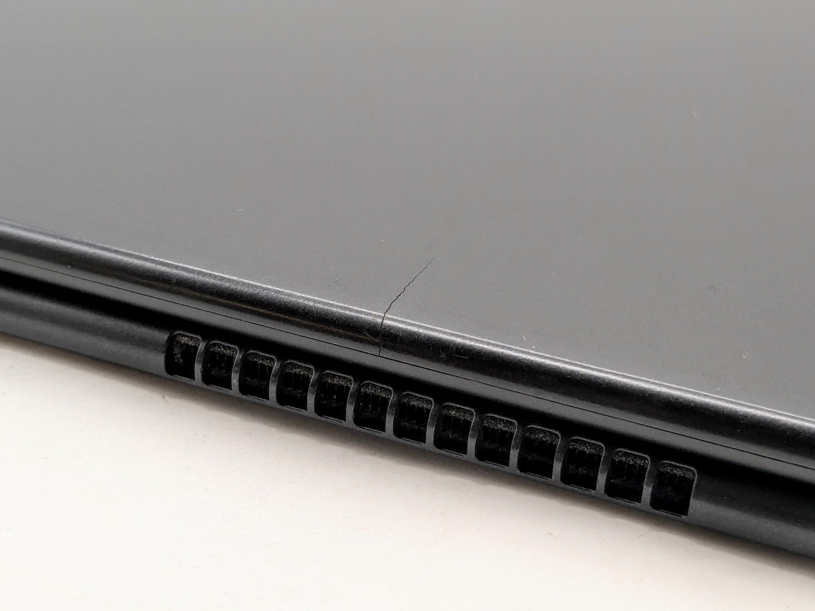 Cosmetic Defects: Interior: Display has visible scratches and keyboard imprinting. Heavy wear on palm rest, keyboard, touchpad, bezel, and around keyboard. Keyboard lattice does not sit flush with system. Wear on hinges. Exterior: Discoloration and scratches on lid and bottom cover, scuffed along edges of device, bottom rubber feet damaged.