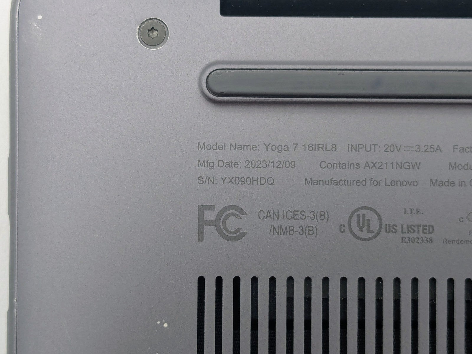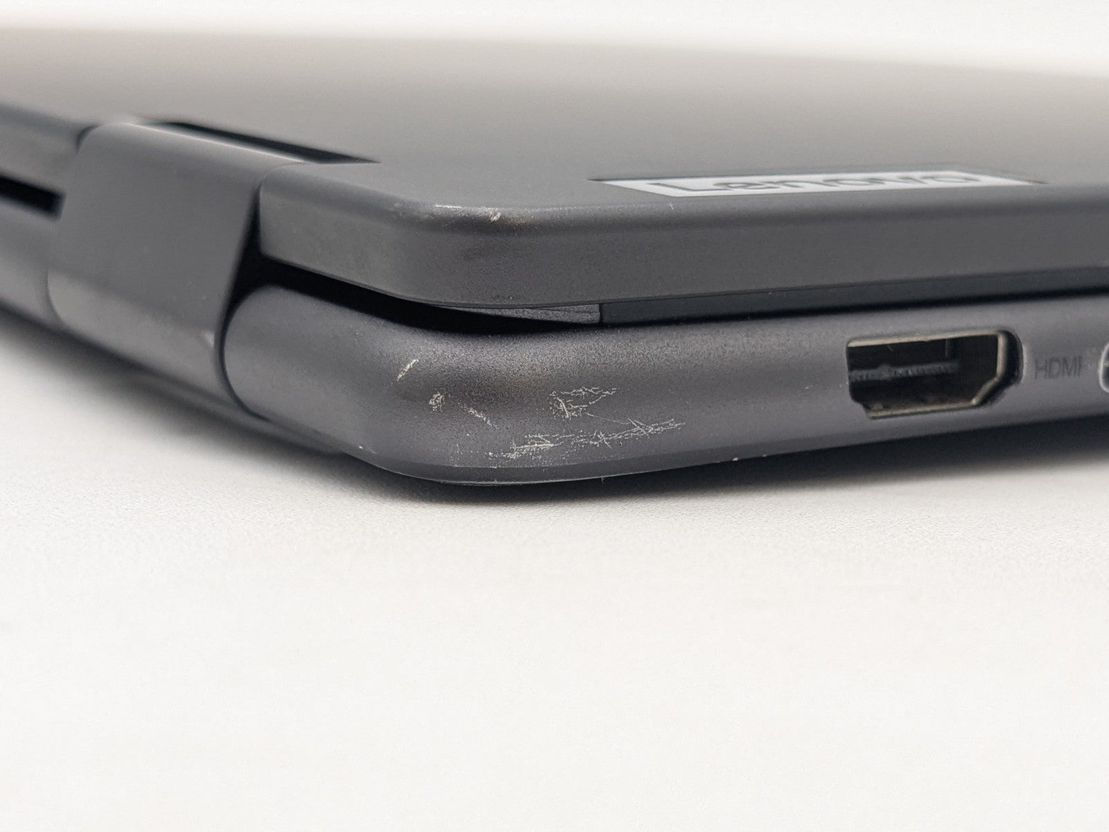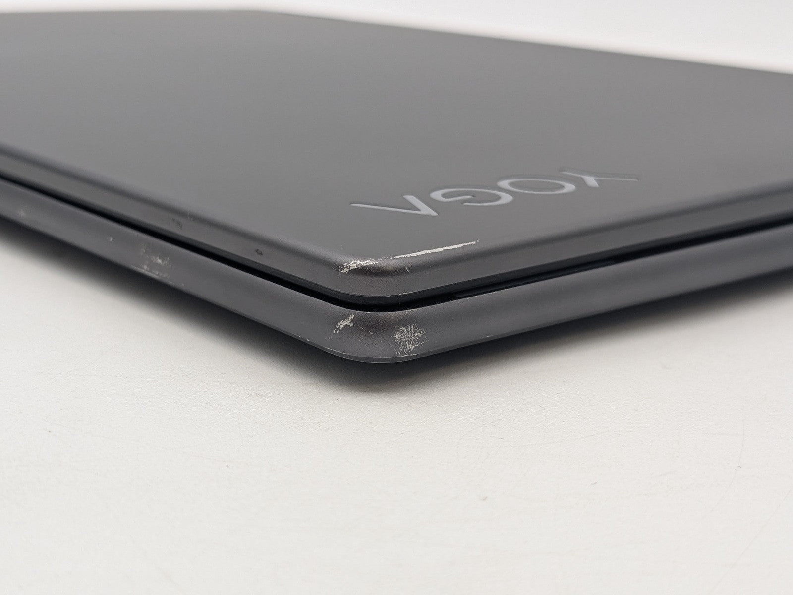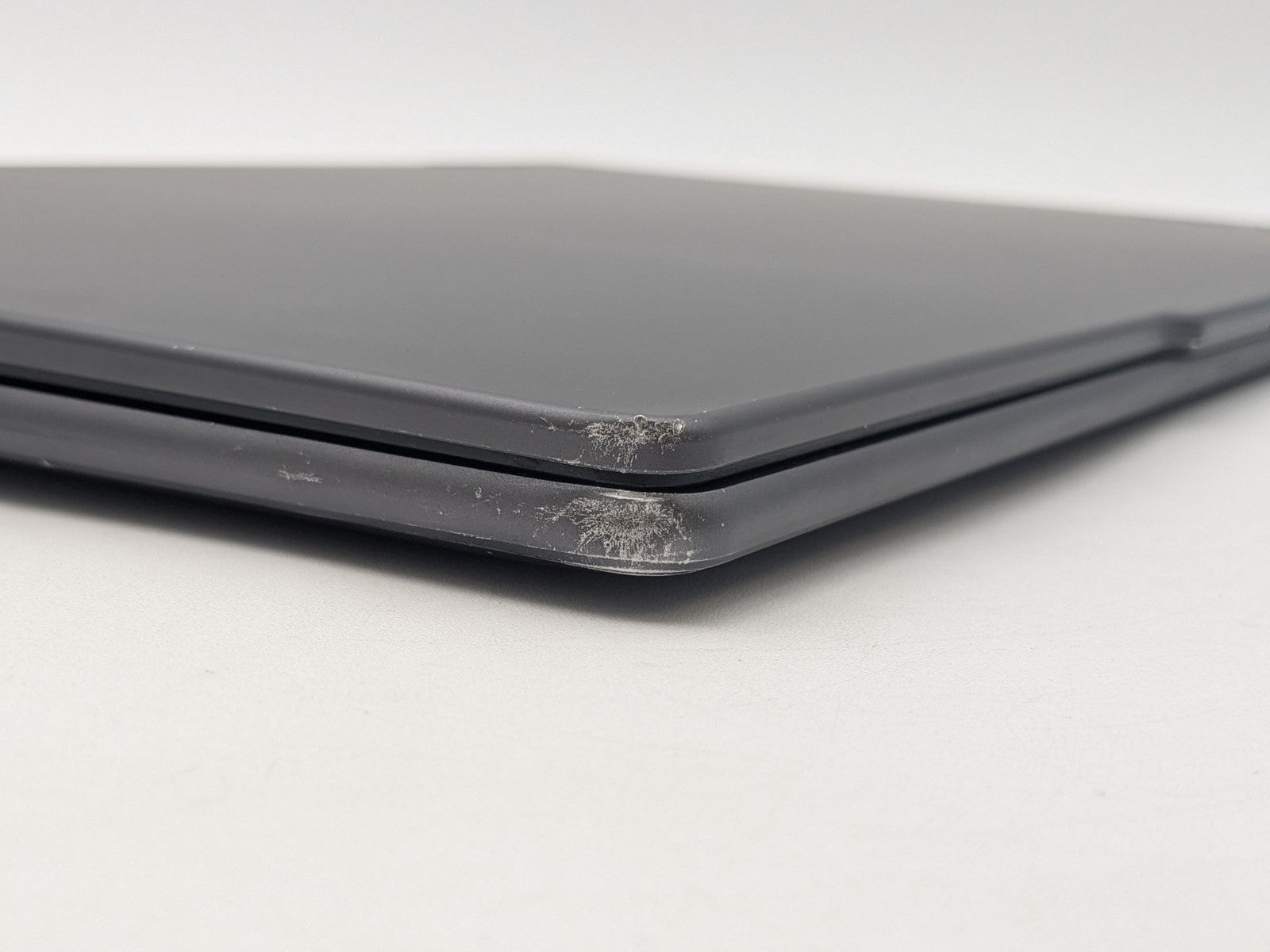 Cosmetic Defects: Interior: Display has visible scratches and keyboard imprinting. Touchpad has heavy wear. Palmrest has visible scratches, paint wear, and fading. Exterior: Both covers have visible edge wear, damaged coating, visible scratches, and front corners are dented and scraped. Mismatched screw.