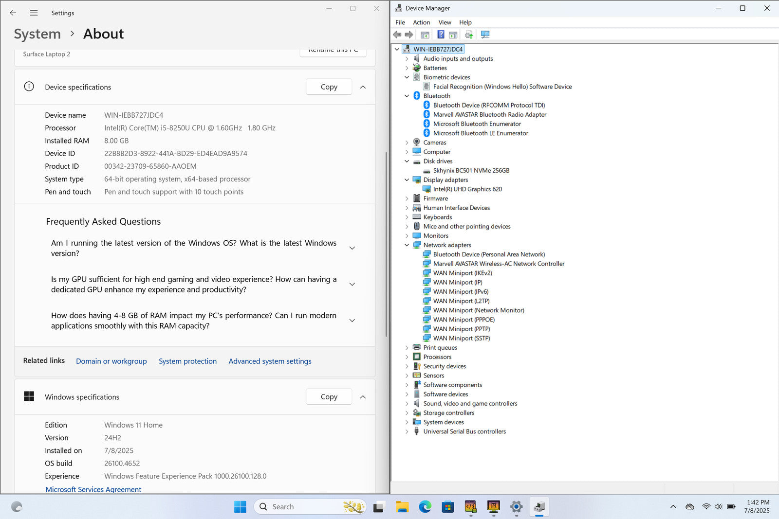 MICROSFT Surface Laptop 2 13" 2256 x 1504 Touch I5-8250U 256GB SSD 8GB W11 IRCam