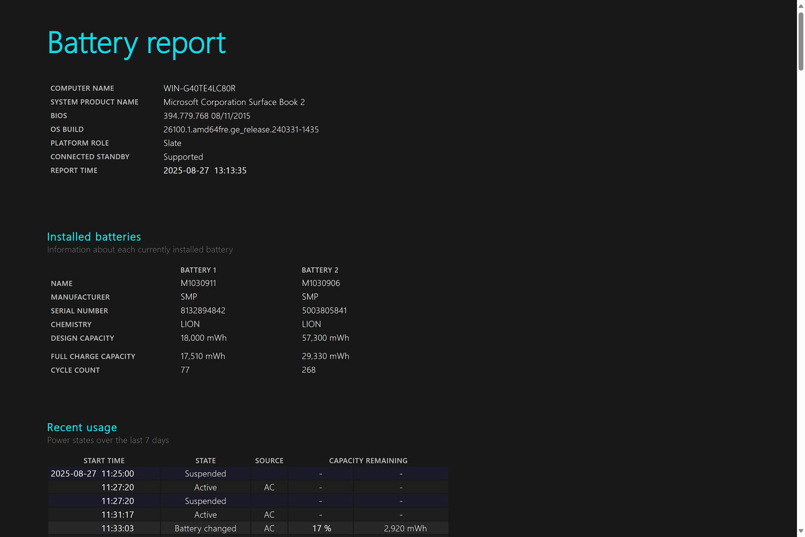 Battery Condition: Battery 1: 17,510/18,000mWh 97.28% | Battery 2: 29,330/57,300mWh 51.19%