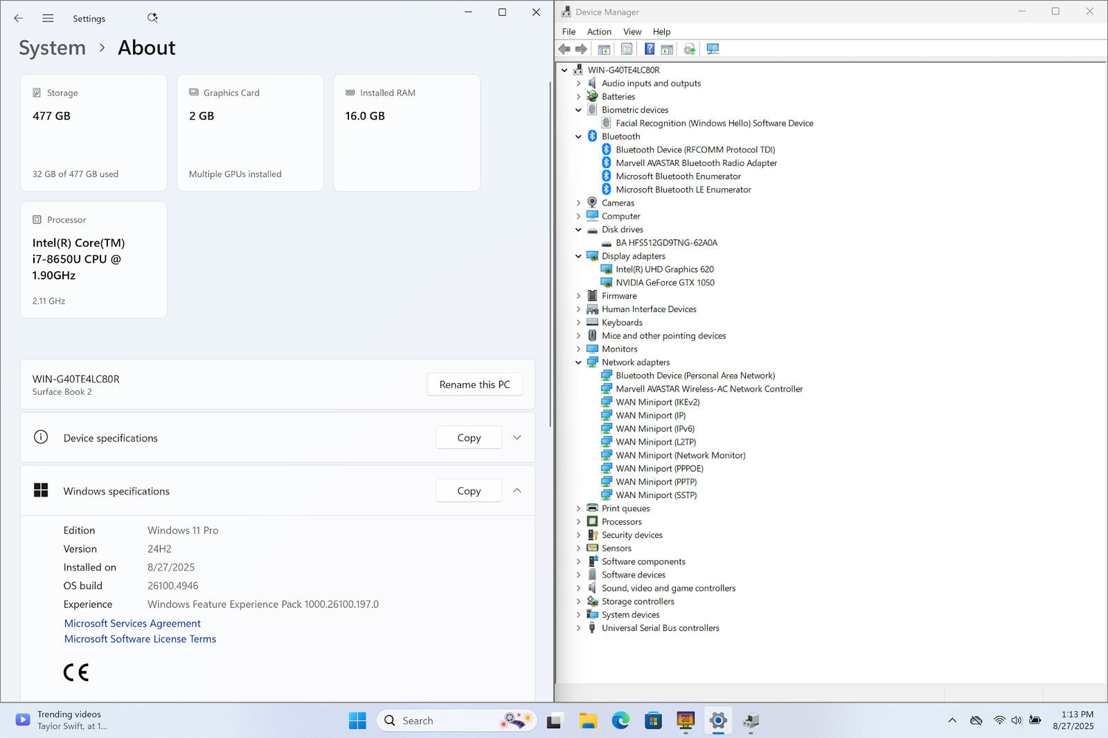 MICROSOFT Surface Book 2 13" 3000 x 2000 I7-8650U 512GB SSD 16GB W11P GTX 1050