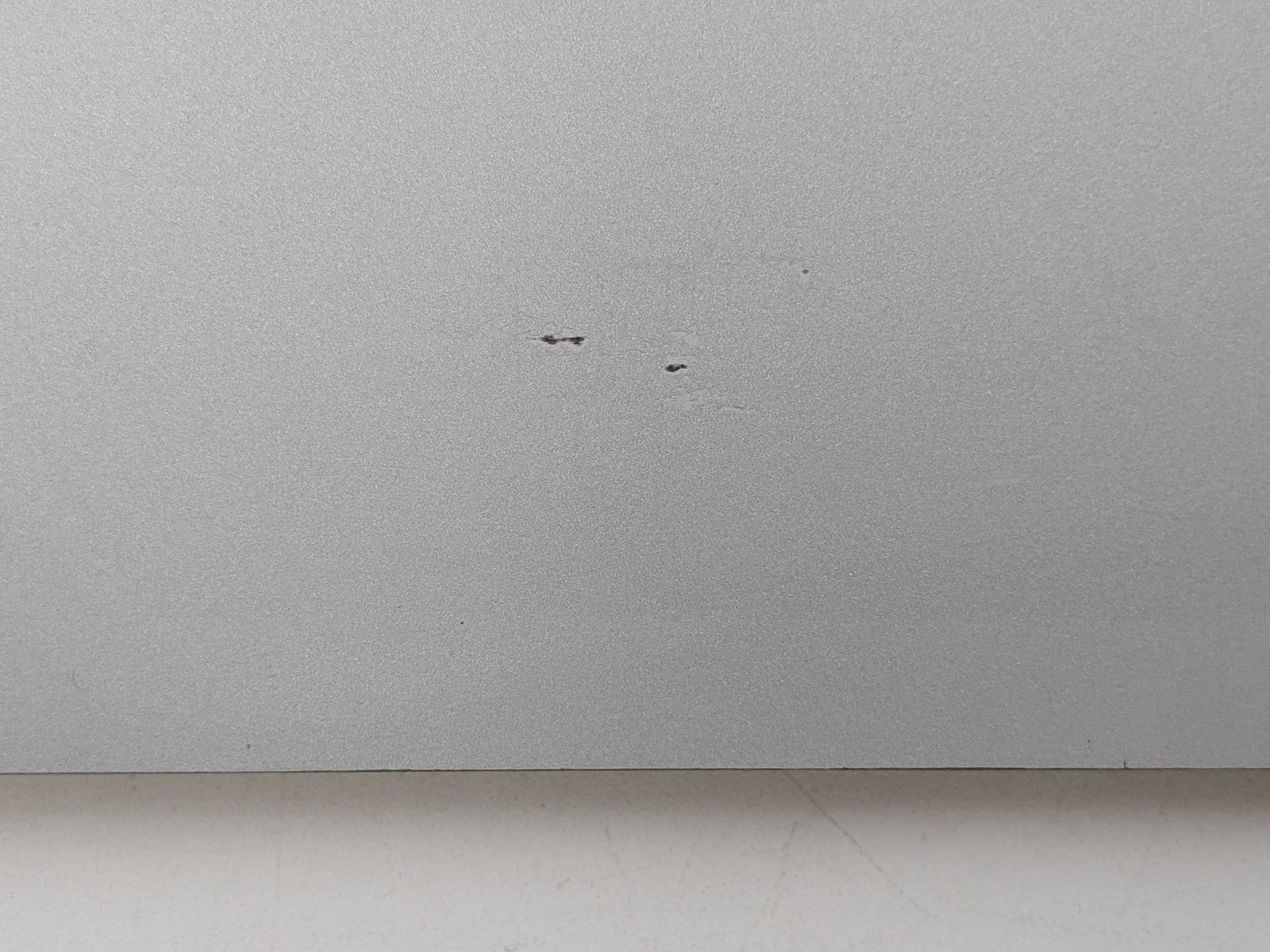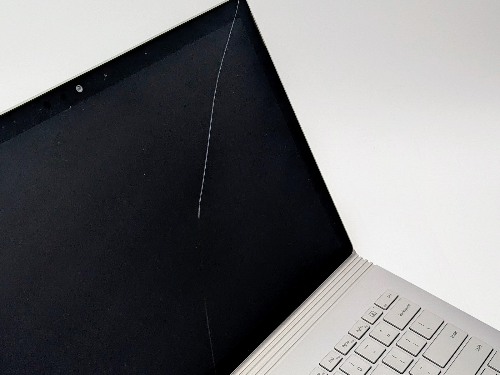 Cosmetic Defects: Interior: Display has visible scratches, one long crack. Moderate keycap wear. Light scratches on palmrest. Exterior: Scratches, scuffs through paint, small dents on both covers. Missing and worn rubber feet.