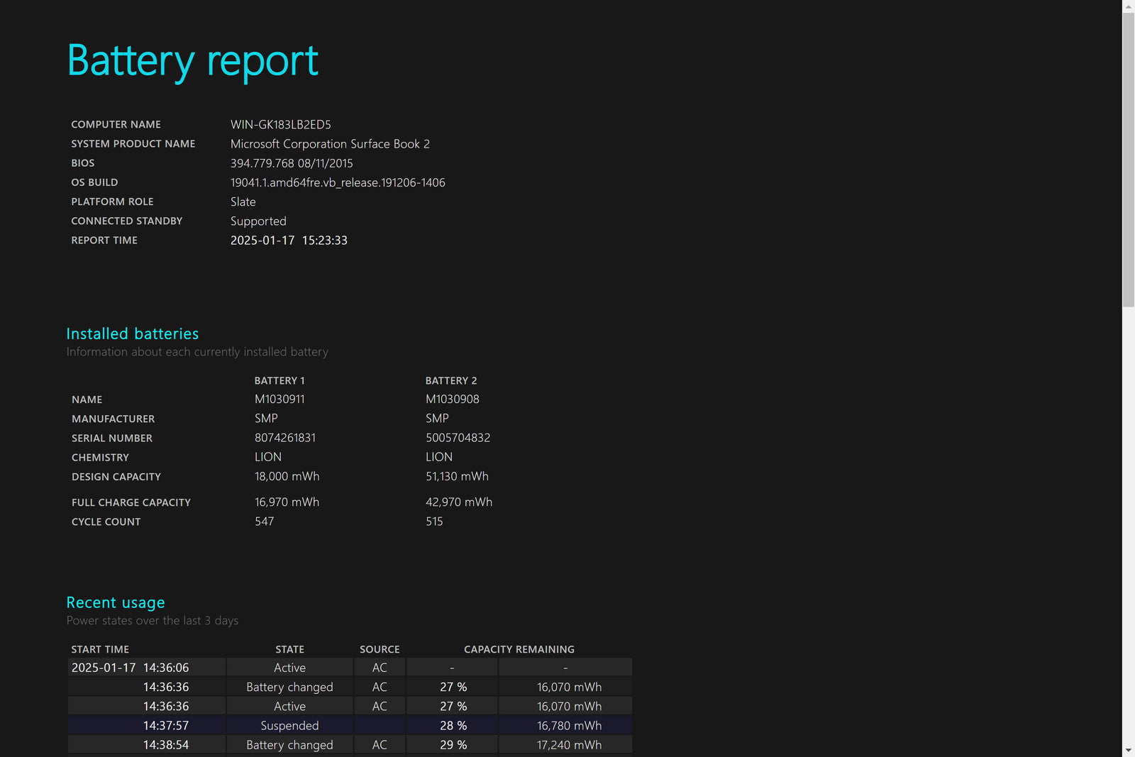 Battery Condition: Battery 1: 16,970/18,000mWh 94.28% | Battery 2: 42,970/51,130mWh 84.04%