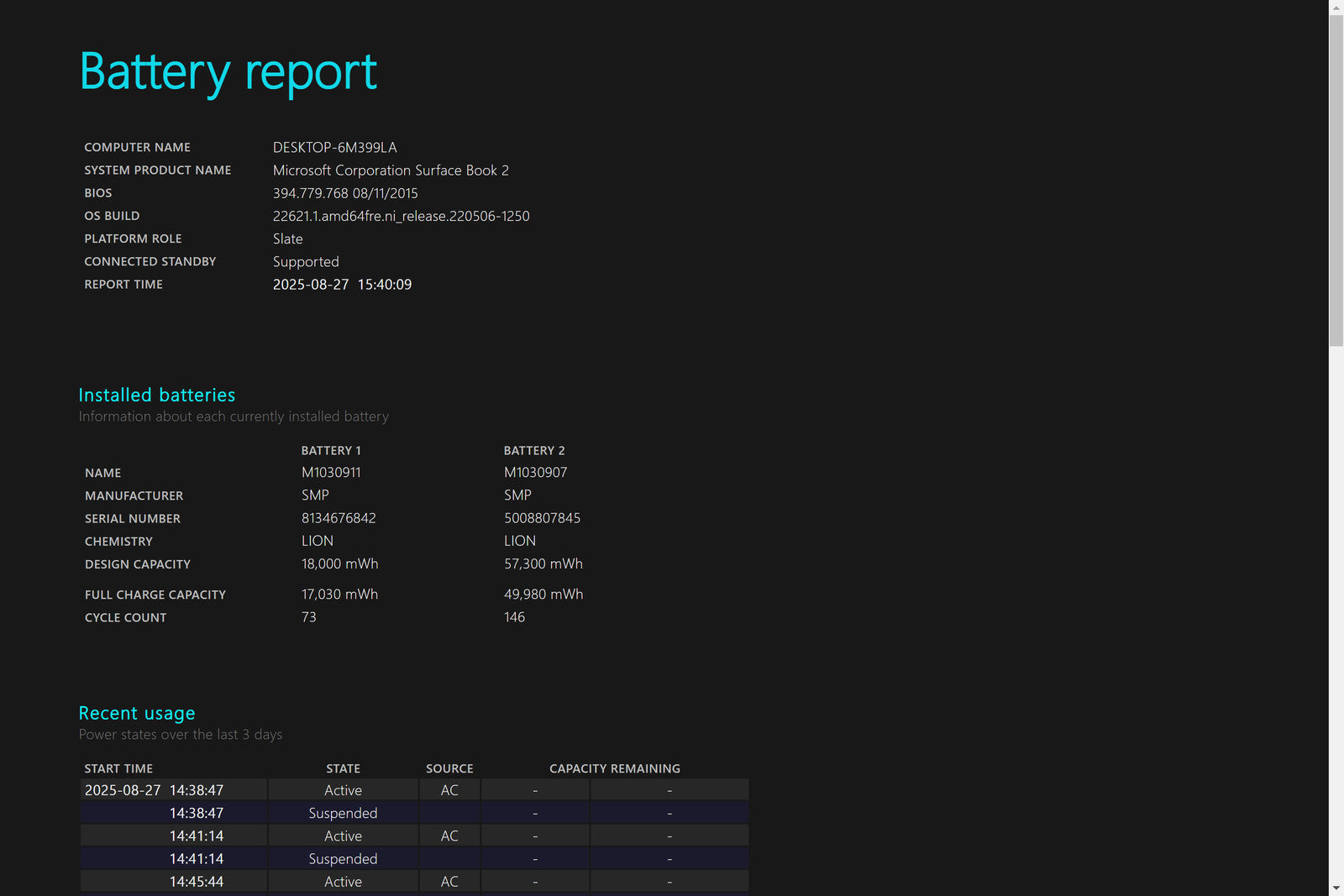 Battery Condition: Battery 1: 17,030/18,000mWh 94.61% | Battery 2: 49,980/57,300mWh 87.23%