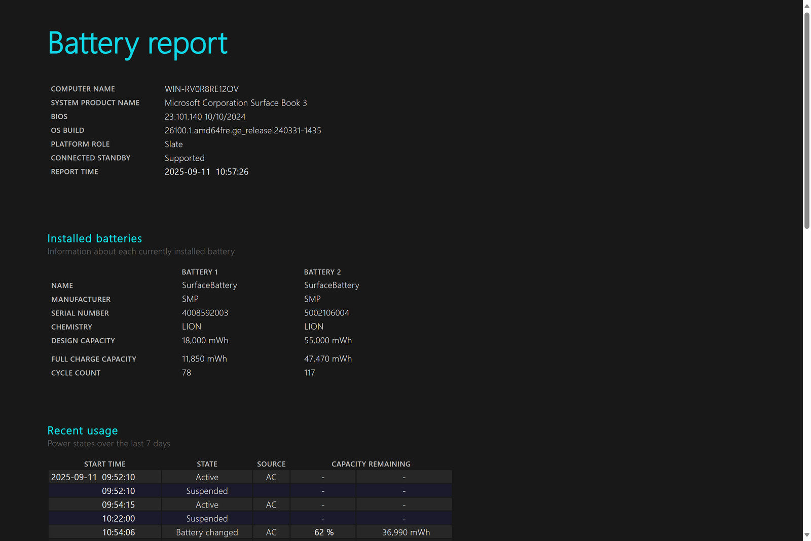 Battery Condition: Battery 1: 11,850/18,000mWh 65.83% | Battery 2: 47,470/55,000mWh 86.31%