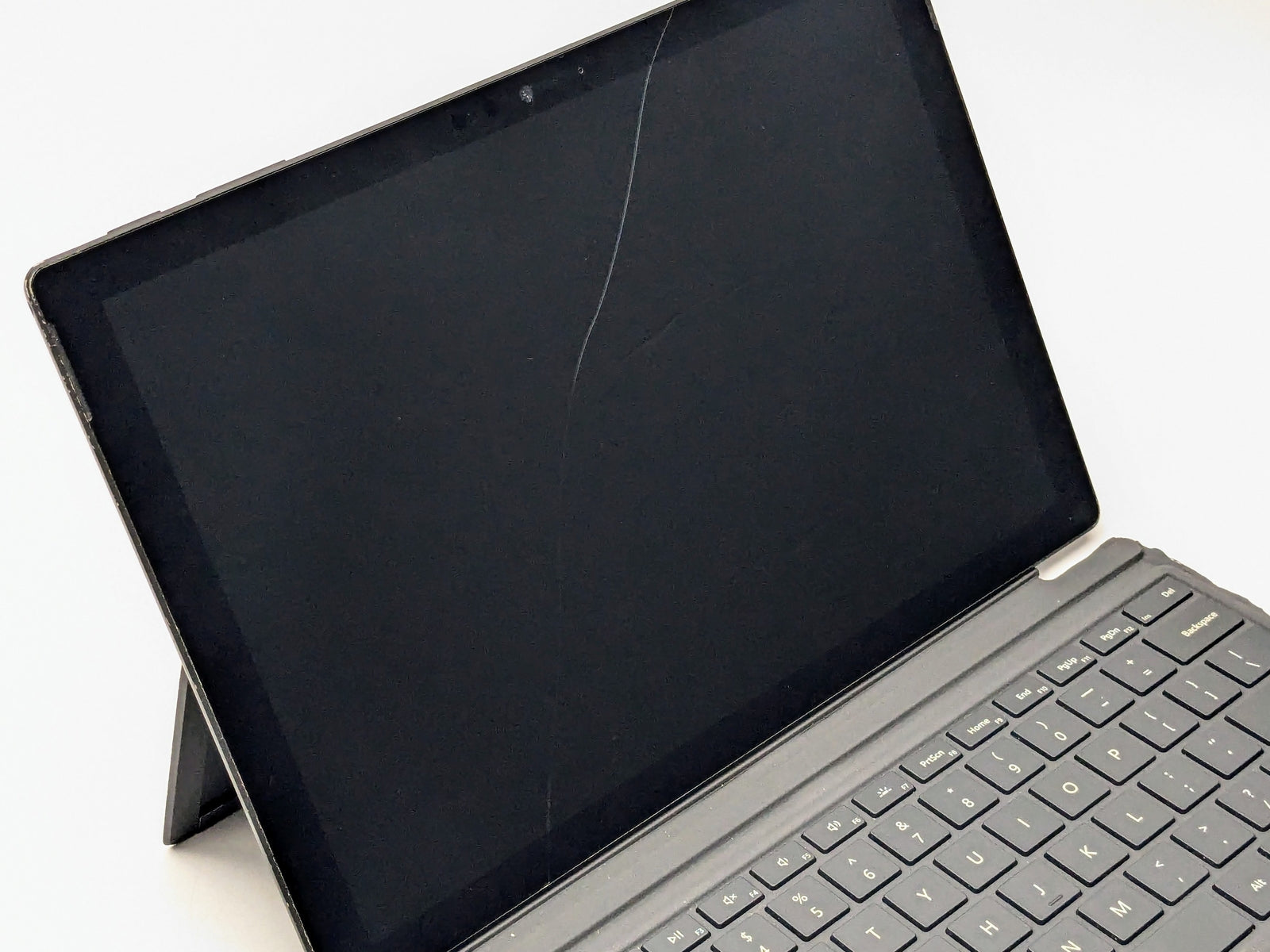 Cosmetic Defects: Interior: Display is cracked. Keyboard/palm rest has heavy wear. Exterior: Back cover has heavy scratches/wear. Keyboard cover has heavy wear.